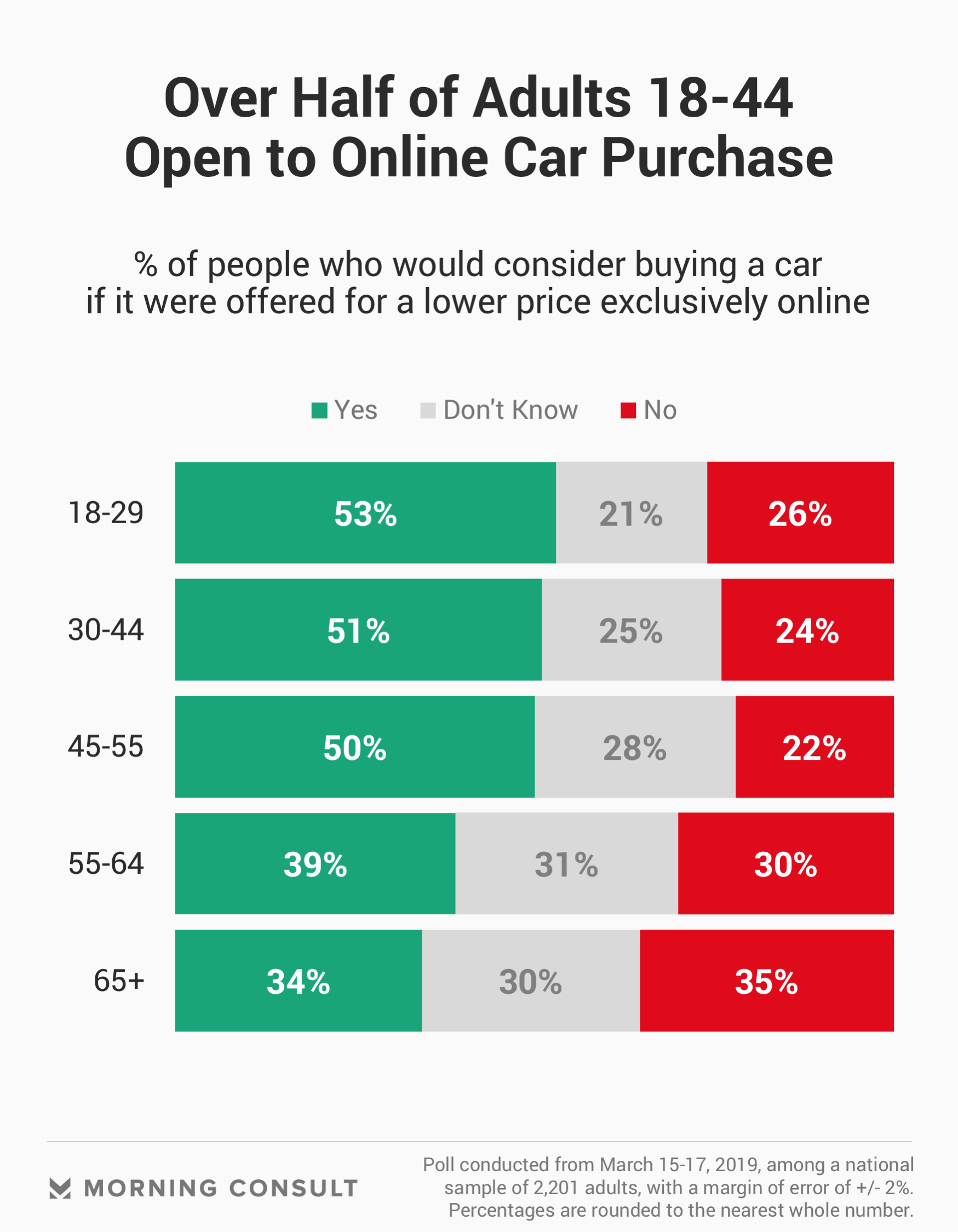 Tesla might have been on to something: In the survey, 46 percent of U.S. adults said they would consider buying a cheaper car offered exclusively online. But sentiment was split across different age groups. Over half of those ages 18-29 and 30-44 said they would consider such an online exclusive offer, while 39 percent of those ages 55 and 64, and 34 percent of people 65 and older said the same.