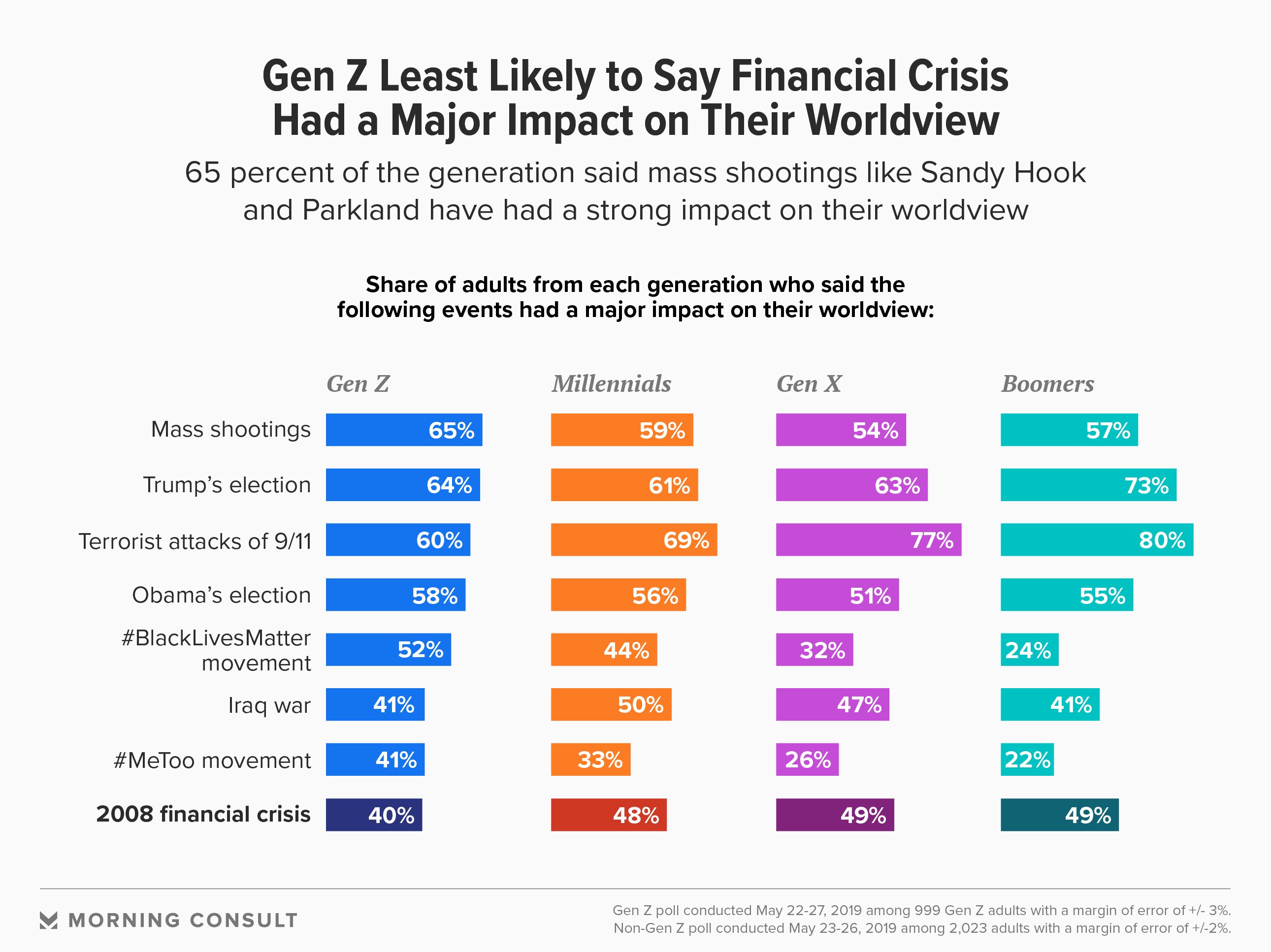 When asked to choose major events that shaped their worldview, 40 percent of Gen Z said the 2008 financial crisis had a major impact -- the lowest-scoring event. Mass shootings like Sandy Hook and Parkland topped the list at 65 percent for Gen Z, followed by President Donald Trump’s election at 64 percent.
