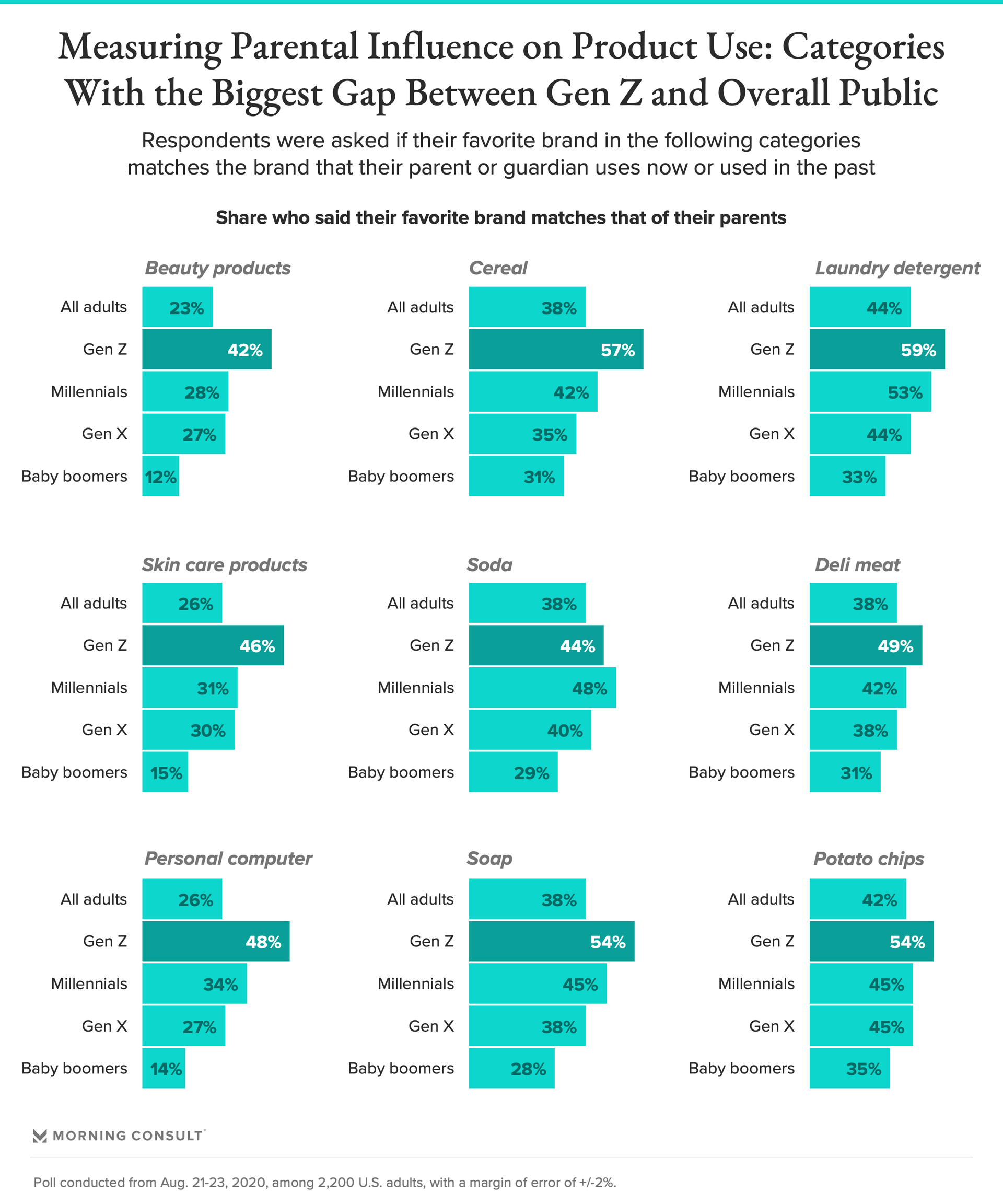 In an Aug. 21-23 survey of 253 Gen Z adults, Morning Consult asked consumers if their favorite brand across 11 product categories matched the brand that their parent or guardian uses now or has used in the past. Across all of the product categories, on average 51 percent of Gen Z adults said their favorite brand is the same one their parents use, compared with 36 percent of adults of all generations. (The margin of error for the Gen Z sample is 6 percentage points, while the margin of error for the wider survey of 2,200 U.S. adults is 2 points.)