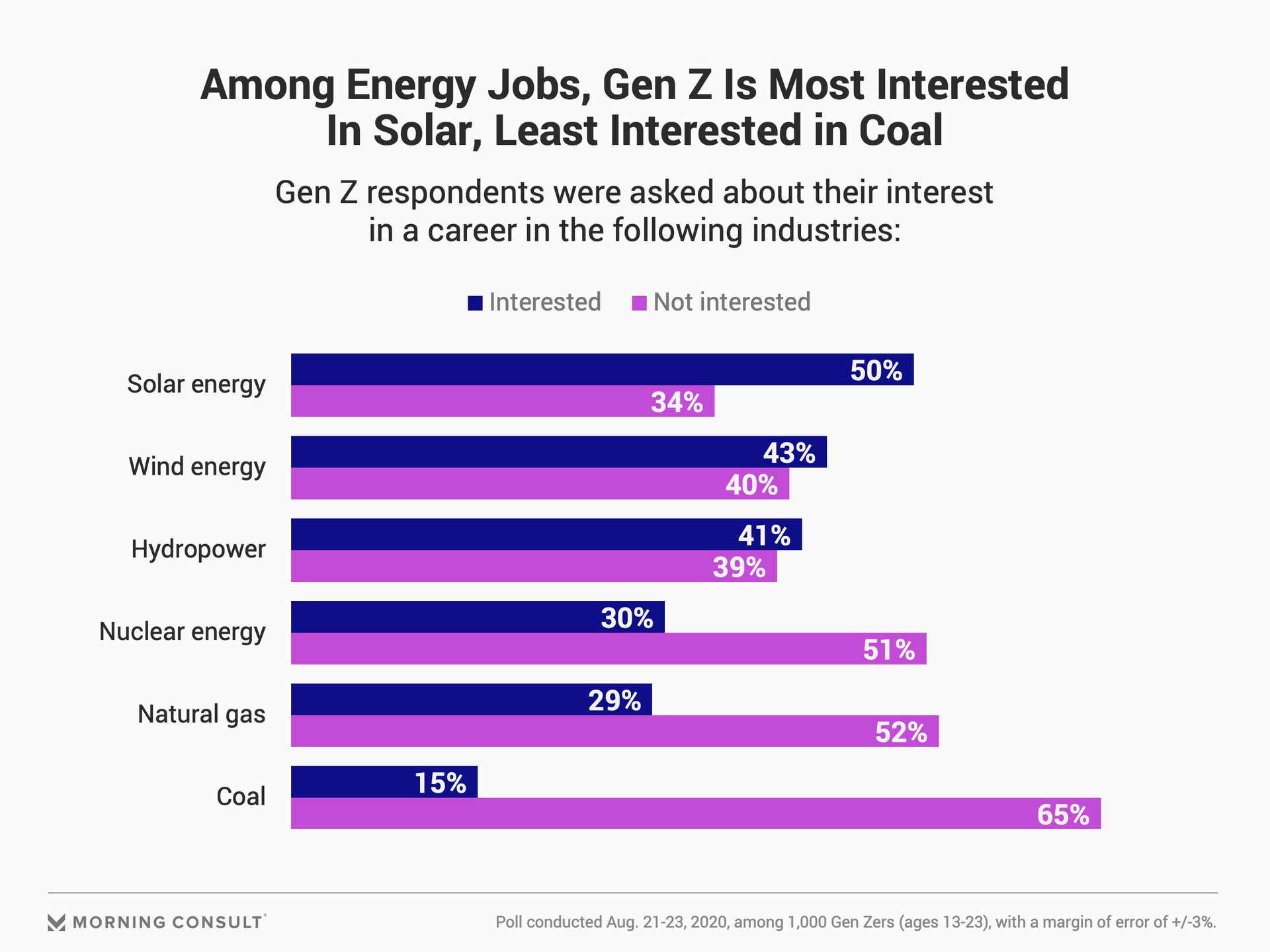 Asked to consider potential energy careers, Gen Zers are much more interested in renewable energy (50% for solar, 43% for wind) than natural gas (29%) or coal (15%).