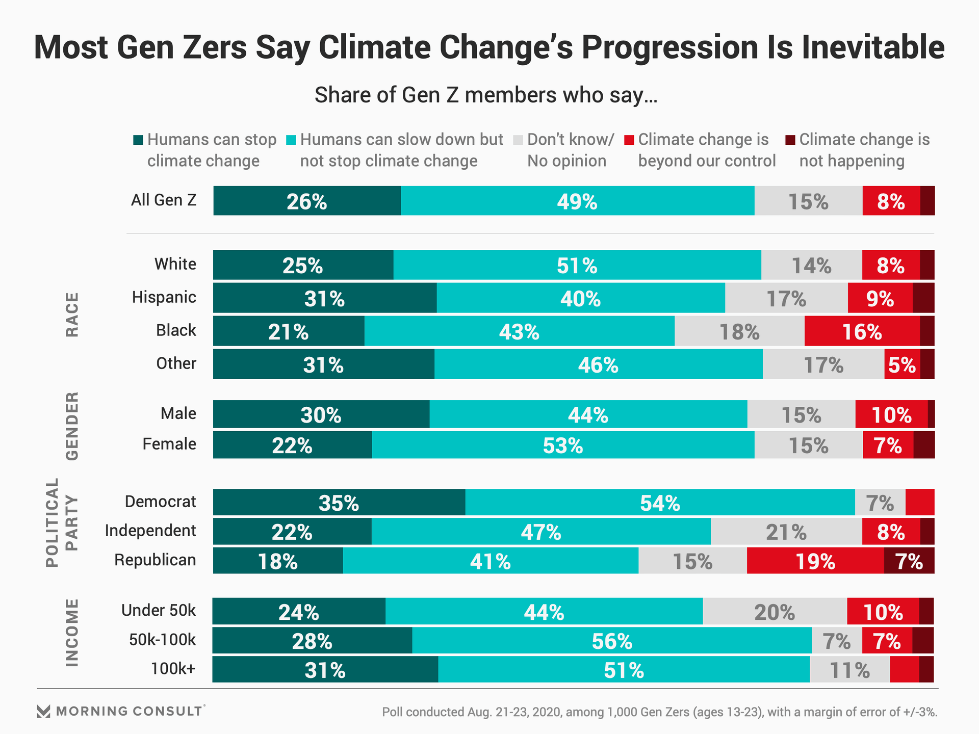 The youngest generation harbors few illusions that climate change has an easy fix, with most saying that its progression is inevitable, new Morning Consult data shows.