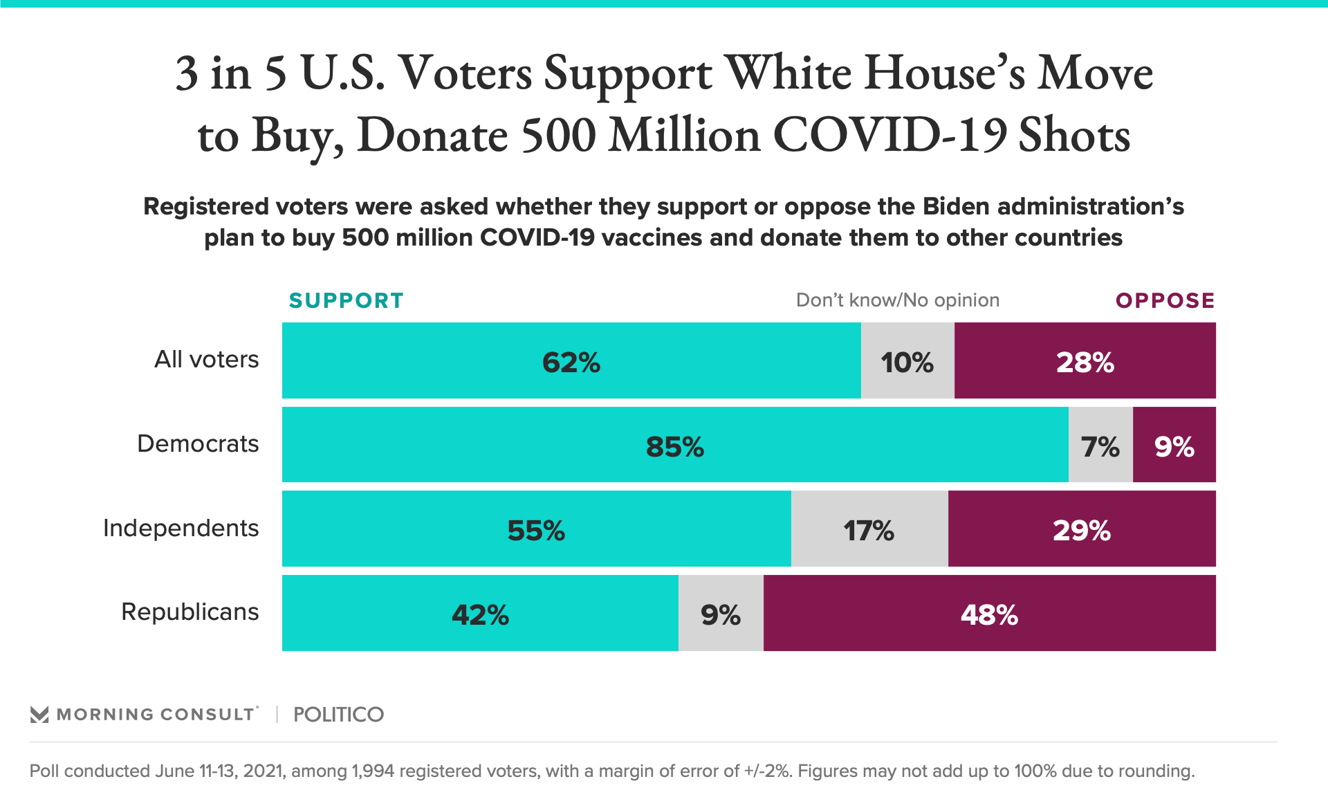 About 3 in 5 U.S. voters support the Biden administration's plan to buy 500 million COVID-19 vaccines from Pfizer Inc.-BioNTech SE and distribute the shots around the world, according to new Morning Consult/Politico polling that comes as global vaccine commitments are panned by health officials.