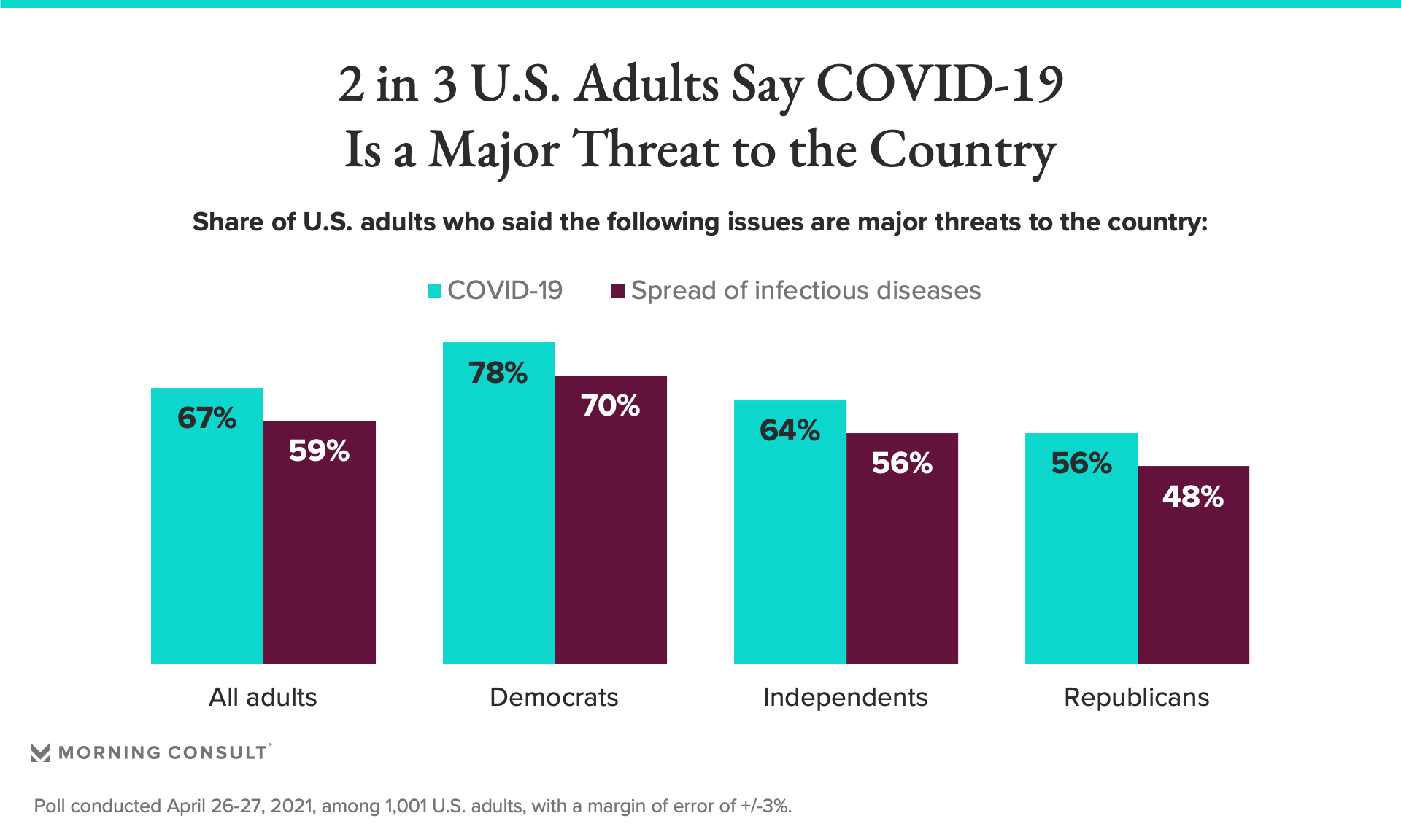 As the international community grapples with the next stage of the pandemic and beyond, new Morning Consult polling indicates that in seven of eight Western countries surveyed, at least 2 in 3 adults say COVID-19 is a major threat to their nations. At least half of adults in the eight countries say the same of the spread of infectious diseases in general.