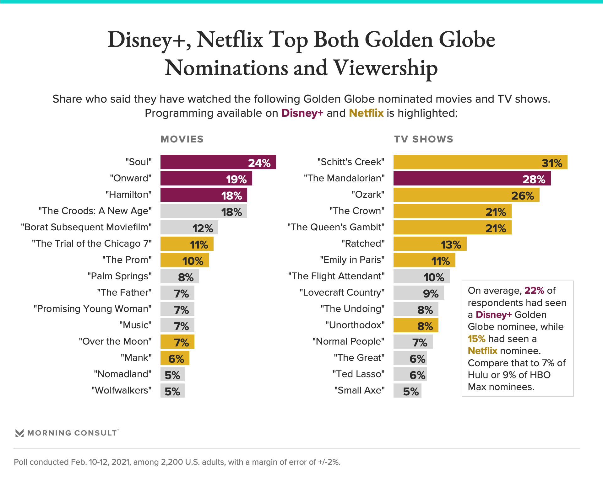 Titles from Walt Disney Co. and Netflix Inc. -- which led Golden Globe nominations with 42, including six nods for the David Fincher film “Mank” and six for “The Crown” -- were the most-watched, with an average of 22 percent and 15 percent of respondents, respectively, saying they have seen a Disney+ or Netflix Golden Globe nominee.