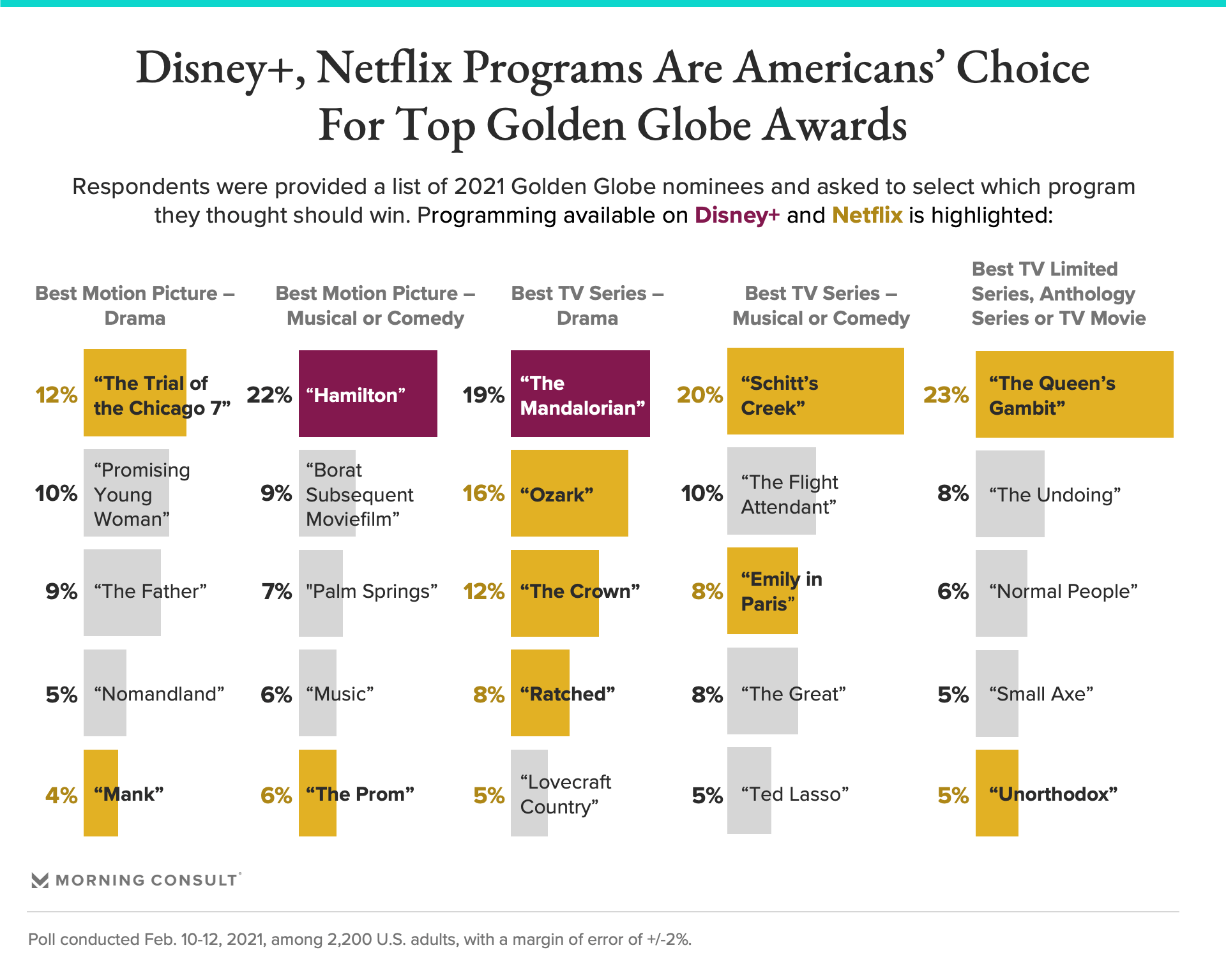On the TV side, the public favors Netflix’s “The Queen’s Gambit,” “Schitt’s Creek” and “The Mandalorian” to win their categories, while cheering on Netflix’s “The Trial of the Chicago 7” and Disney+’s “Hamilton” for the film accolades.