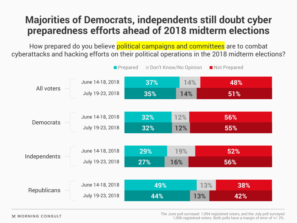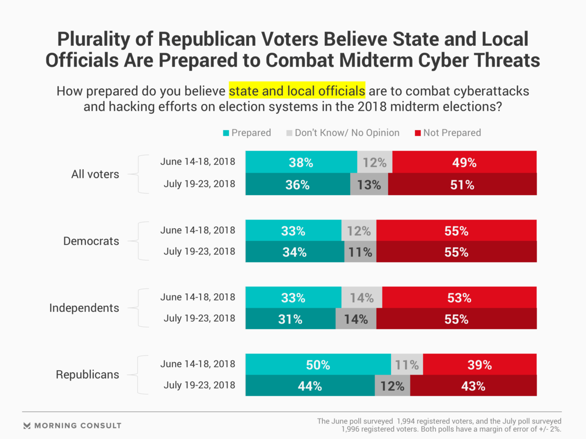 Majorities of U.S. voters believe state and local officials, as well as political campaigns and committees, are not prepared to combat cyberattacks or hacking efforts targeting the 2018 midterms, according to a new Morning Consult/Politico poll -- with Republican voters in particular growing more skeptical about cyber preparedness in advance of the November elections.