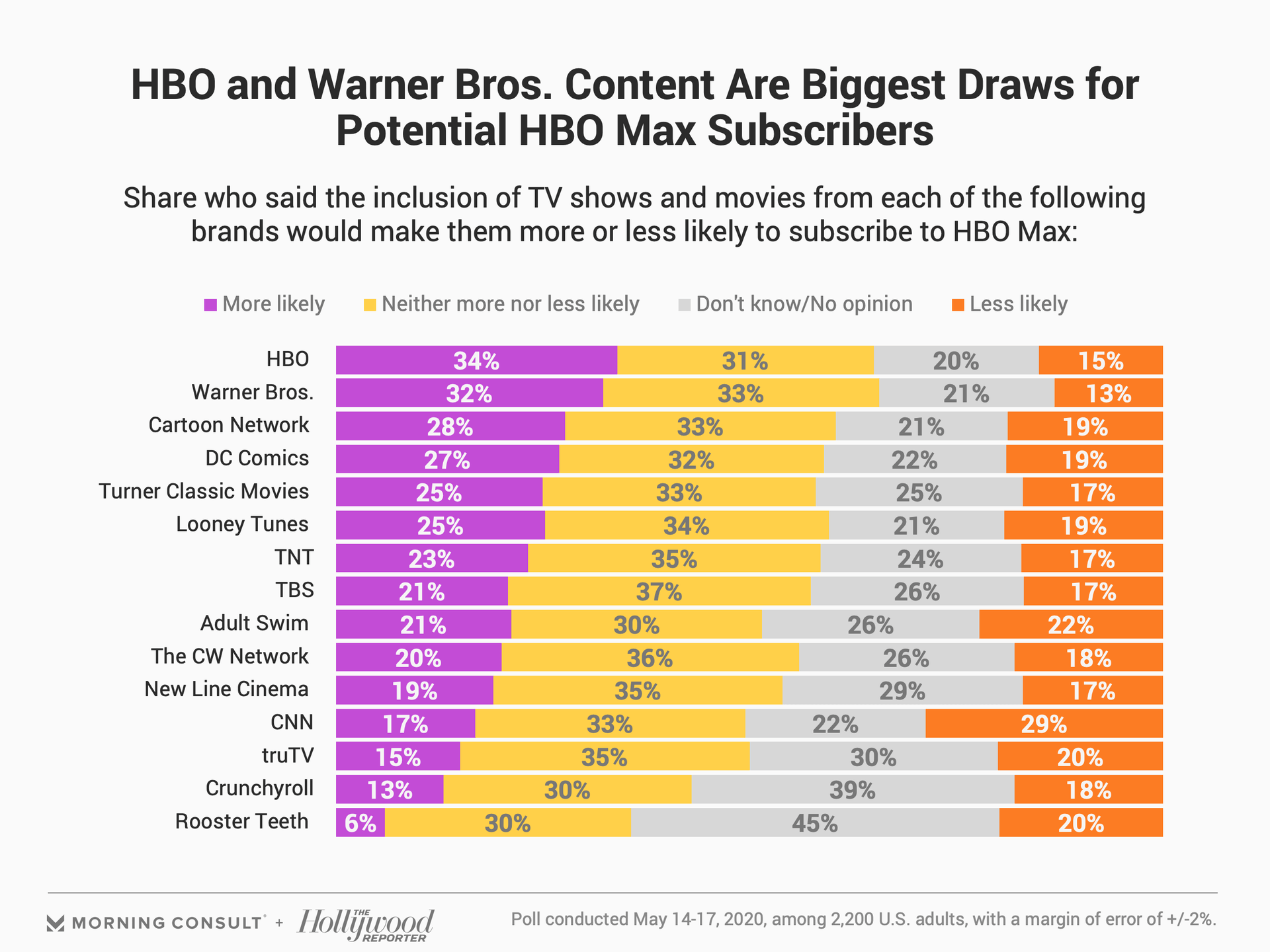Thirty-four percent of respondents said HBO’s offerings would make them more likely to subscribe to HBO Max, while 27 percent said the same of content from DC Comics. Both catalogs will be included on the platform.