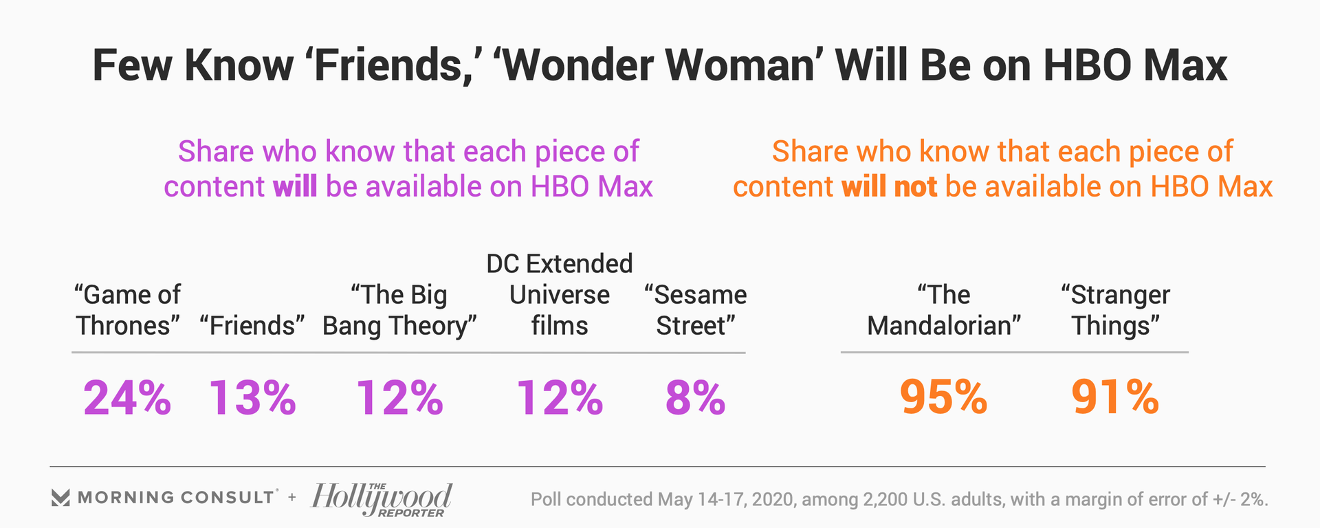 A May 14-17 Morning Consult/The Hollywood Reporter poll asked 2,200 U.S. adults to select from a list of TV shows and movies which ones they believed would be available on HBO Max at its launch. Roughly a quarter of adults (24 percent) knew “Game of Thrones” would be part of the service, while 13 percent said the same of “Friends.” Twelve percent knew “The Big Bang Theory” and DC Extended Universe movies, such as “Wonder Woman” and “Aquaman,” would be included.