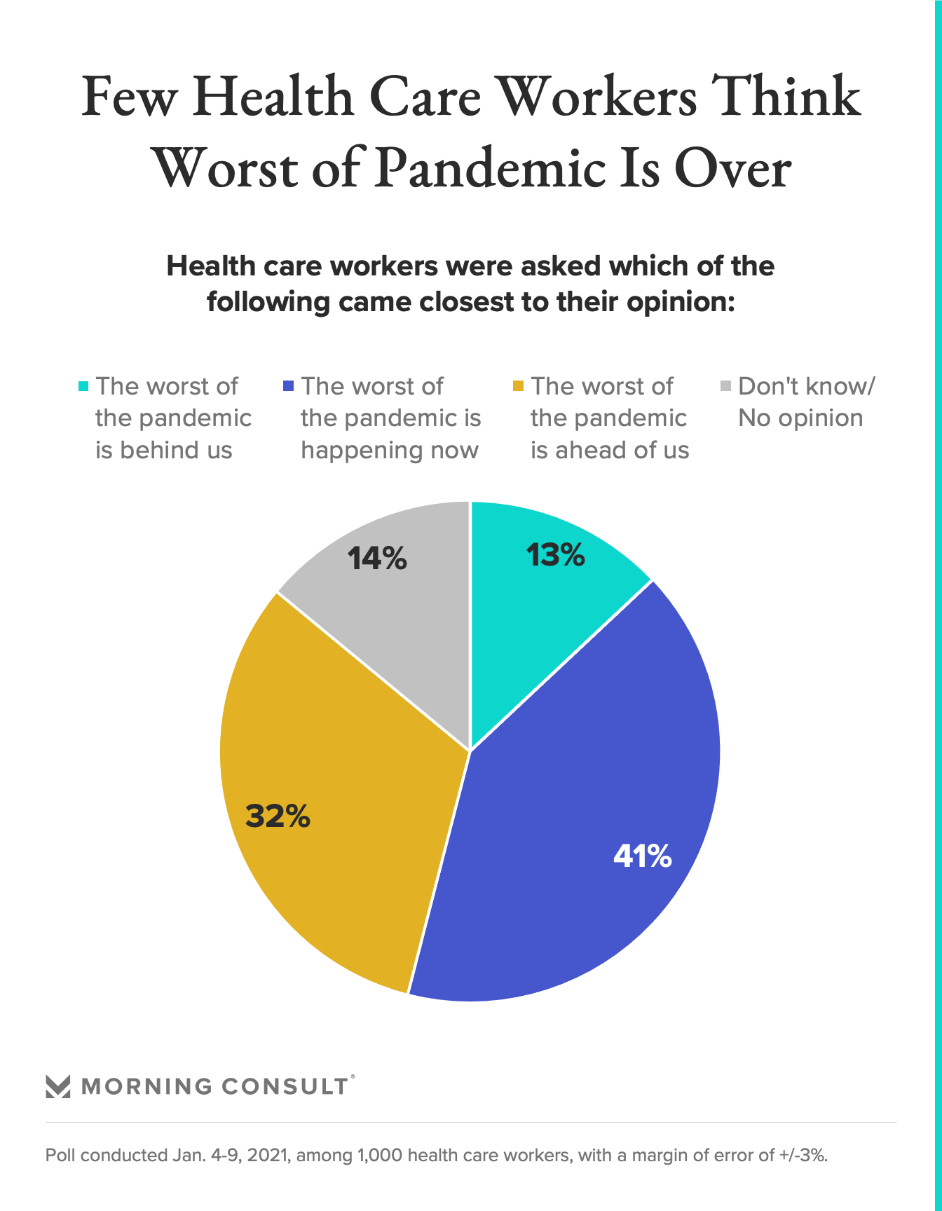 Now, 2 in 5 health care workers say the country is in the darkest point of the COVID-19 pandemic, while another 32 percent say the worst is yet to come. Just 13 percent of health care workers think the United States has passed the worst phase of the pandemic.