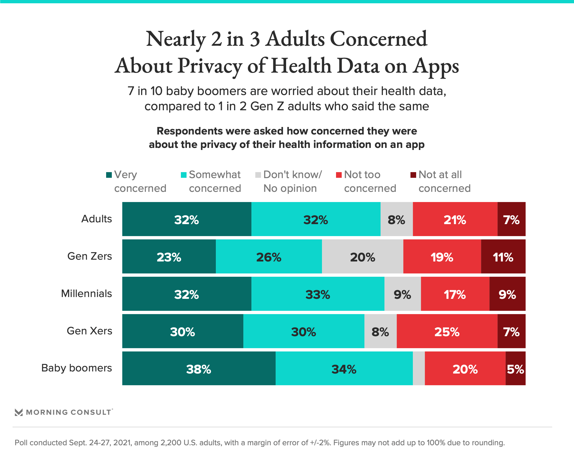 According to a Morning Consult poll, 64 percent of U.S. adults said they are concerned about the privacy of their health information and personal data. Those worries about privacy are less pronounced among Gen Z adults, of whom 49 percent said they are concerned. The rate of concern increases among older generations, including 65 percent of millennials, 60 percent of Gen Xers and 72 percent of baby boomers.