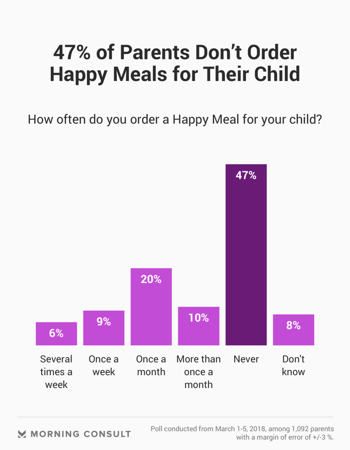 Among 1,092 parents in a Morning Consult poll of 2,201 adults conducted March 1-5, 56 percent said they are unlikely to order a Happy Meal for their children in the coming month, compared to 39 percent who said they likely will. The margin of error for the subsample of parents is 3 percentage points.