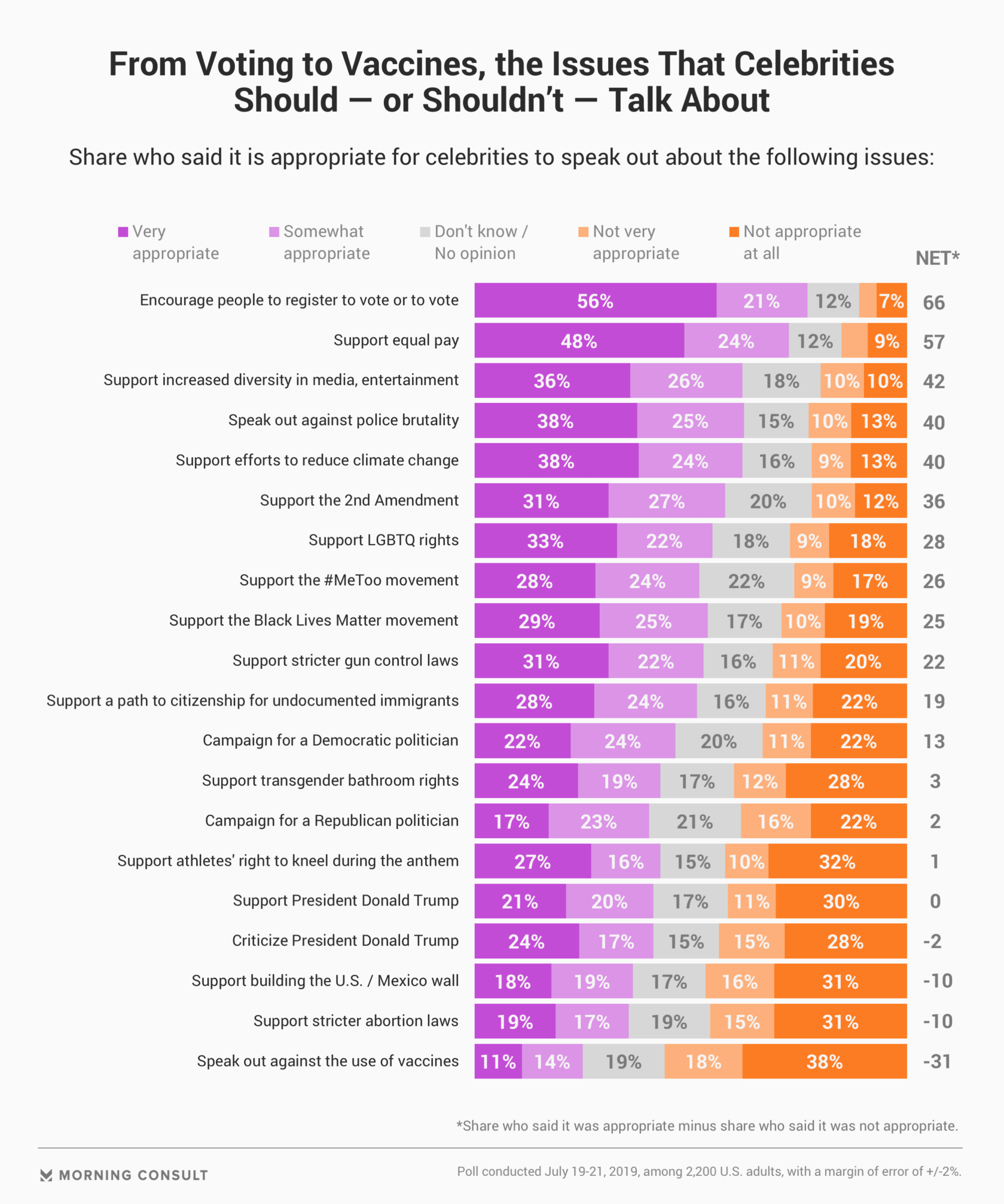 Although for many issues listed in the survey of 2,200 U.S. adults -- including supporting stricter gun control laws or supporting a path to citizenship for immigrants living in the country illegally -- there’s net positive support for celebrities speaking out, roughly 3 in 10 respondents said taking a stance on those issues was inappropriate. Strictly political topics, such as criticizing President Donald Trump or supporting a partied candidate, are quite divisive.