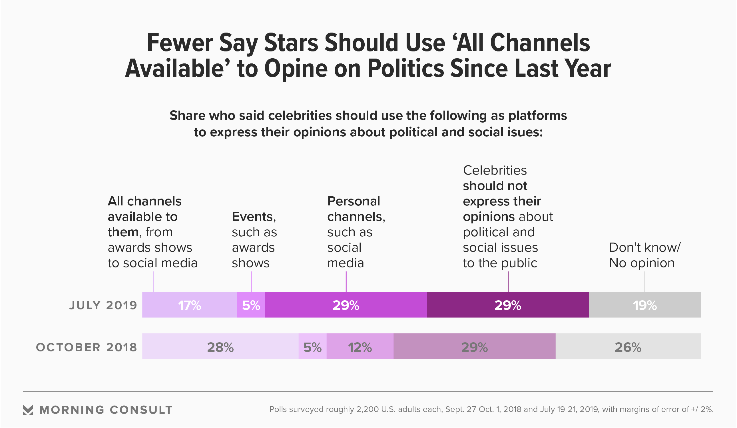 Compared to an October 2018 poll, respondents were 11 points less likely to say that stars should use all channels available to them, from awards shows to social media, to discuss important political topics, and they were 17 points more likely to say celebrities should mostly stick to their personal channels when posting about political and social issues.