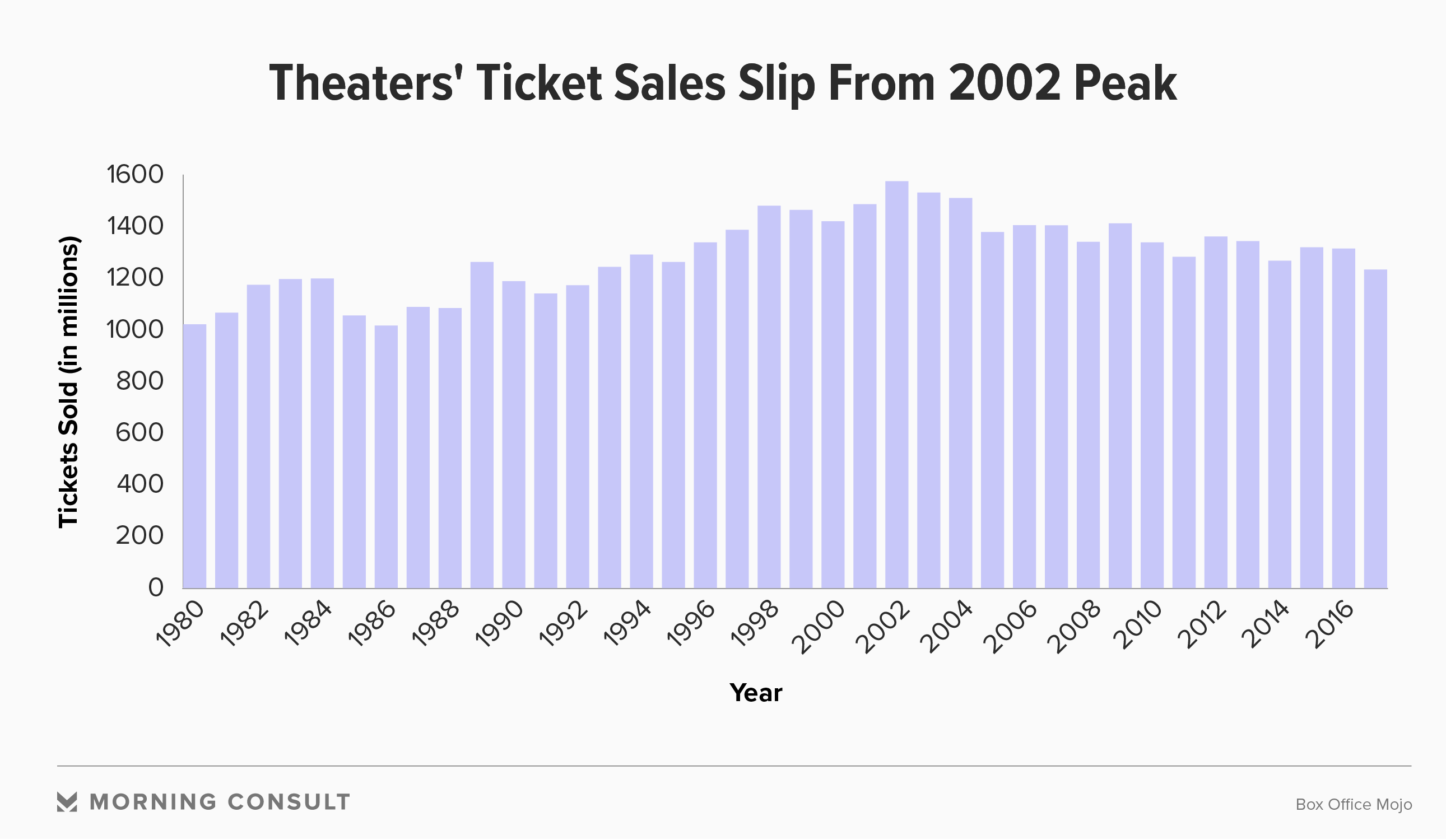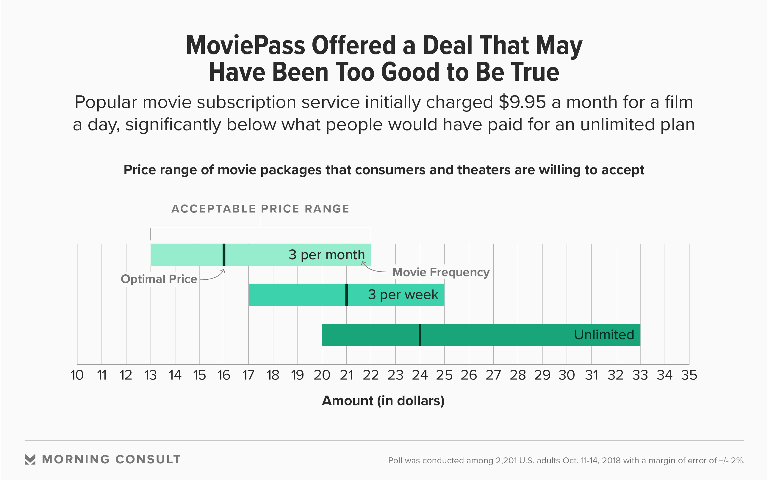 Several of the theater chains have started their own subscription offers to compete with MoviePass, which started to gain traction when Helios and Matheson Analytics Inc. bought a majority stake in the firm in August 2017 and started offering people a $9.95-per-month movie subscription for one movie a day -- significantly lower than consumers’ optimal price, according to the Morning Consult analysis.