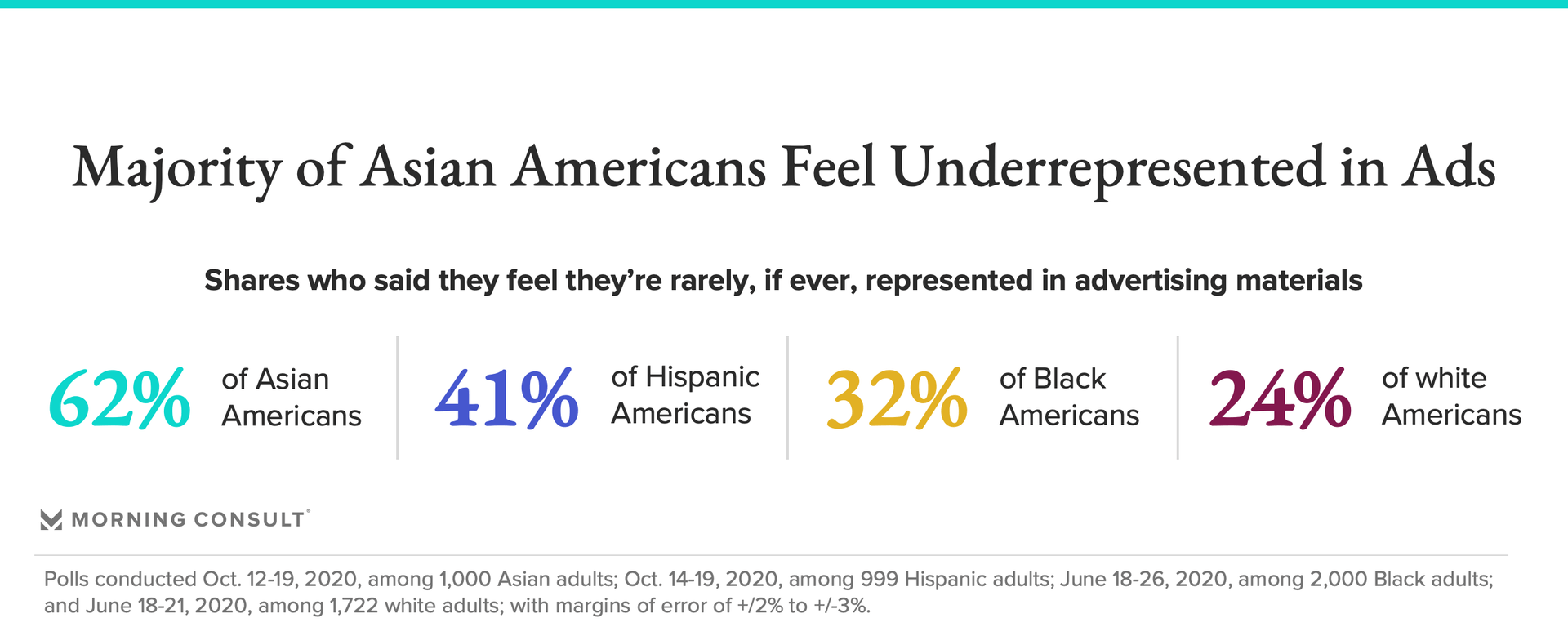 Ever since the resurgence of the Black Lives Matter movement this summer, many brands have taken steps to feature more Black consumers in their marketing efforts. But new polling from Morning Consult shows that other major groups of U.S. consumers — Asian Americans and Hispanic Americans — feel even more underrepresented in advertising than Black and white Americans.