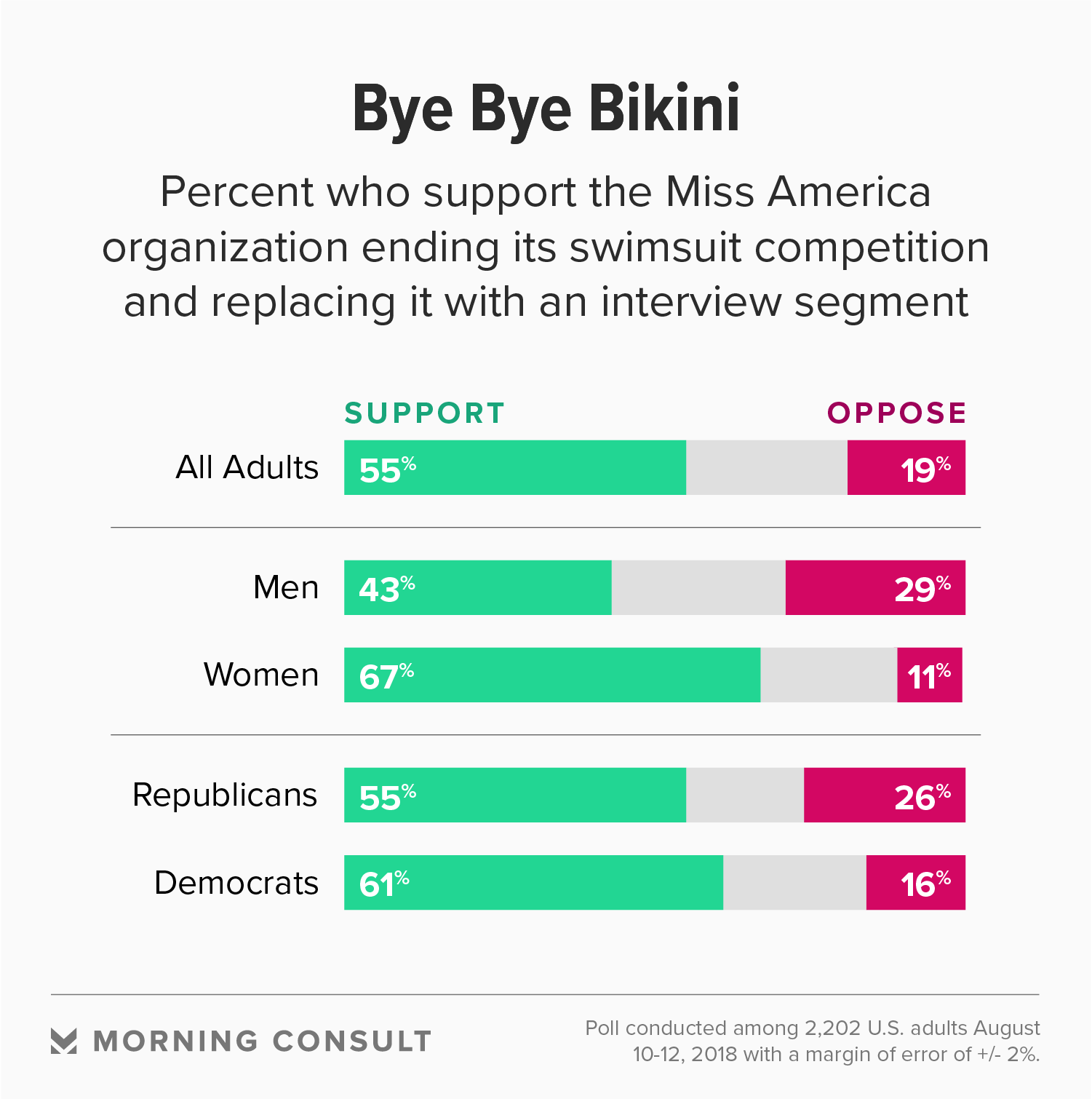 Fifty-five percent of respondents in the Aug. 10-12 Morning Consult survey said they supported the Miss America Organization’s decision to end its swimsuit contest, while 19 percent were opposed.