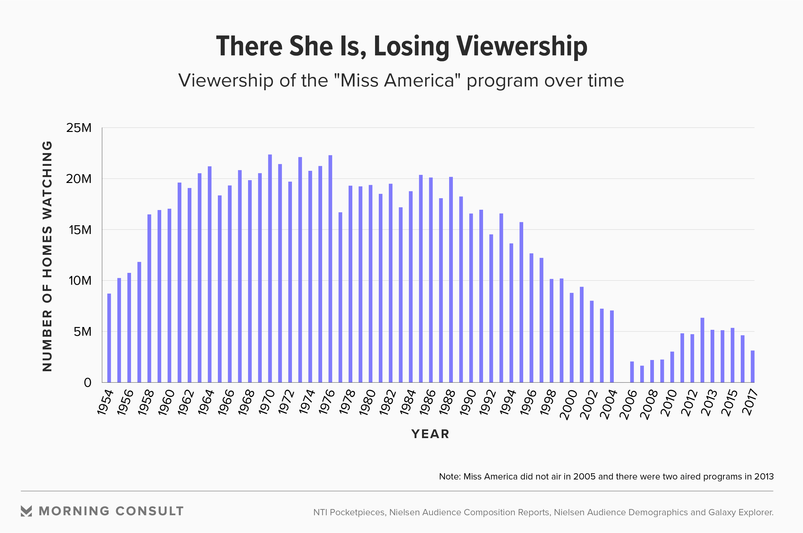Miss America’s viewership has plummeted since the 1970s. Roberts attributed this partly to changing attitudes on the objectification of women -- and on beauty pageants, which led to a decline in Miss America’s cultural relevance. Experts said media fragmentation has also played a role.