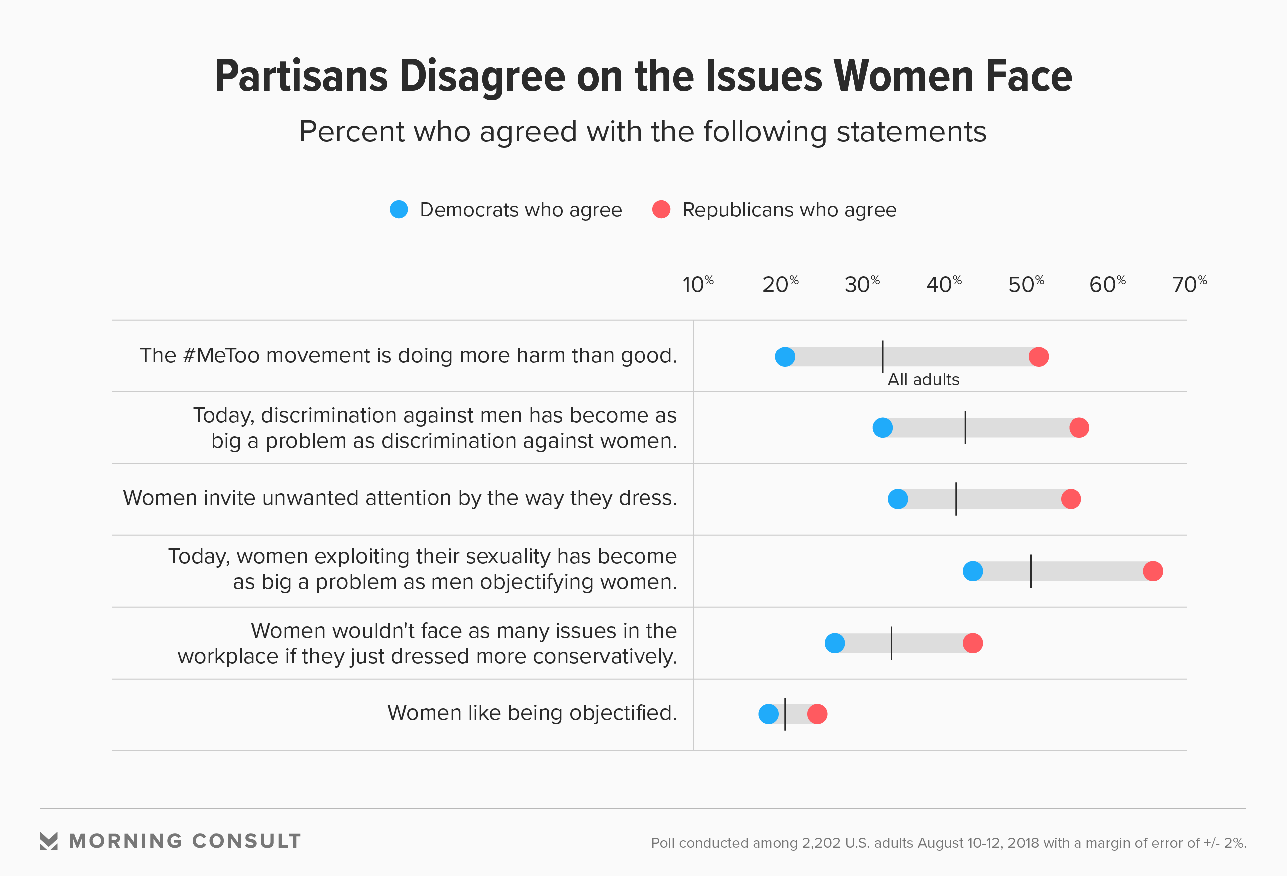 Majorities of Republicans agree with statements such as “Today, women exploiting their sexuality has become as big a problem as men objectifying women” (66 percent); “Women invite unwanted attention by the way they dress” (56 percent); and “The #MeToo movement is doing more harm than good” (52 percent).
