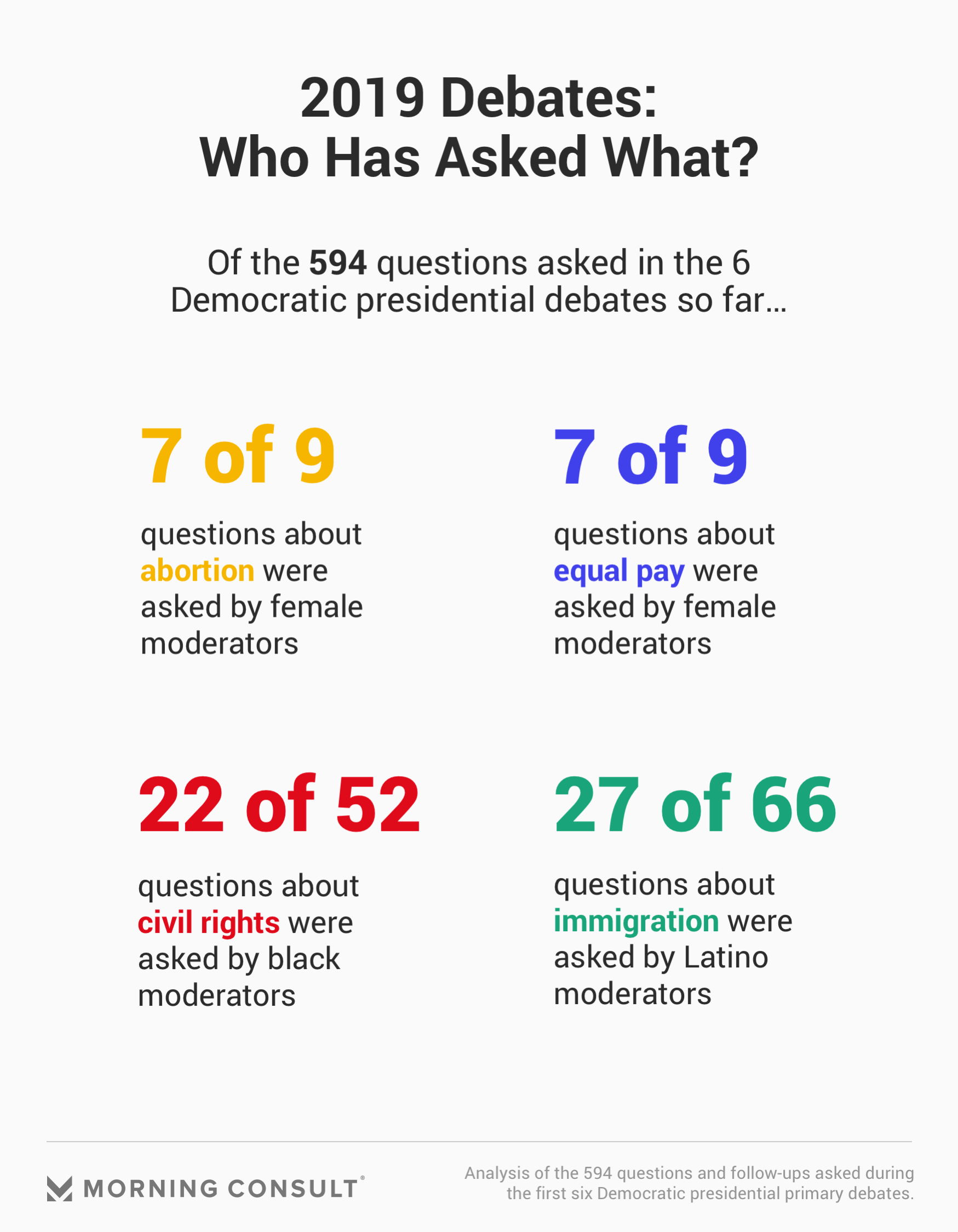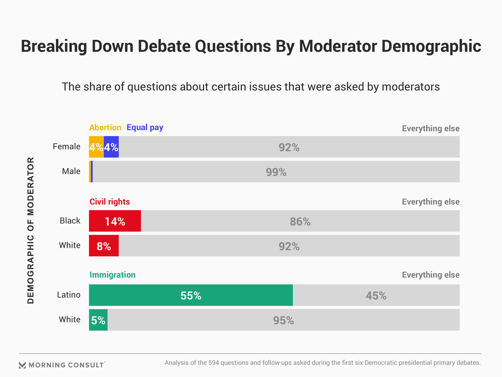 The descriptive representation theory has played out on stage in each of the Democratic debates: Female moderators asked 14 of the 18 questions about abortion and equal pay, focusing generally on the landmark Roe v. Wade Supreme Court case and how to compel businesses to address the pay gap between men and women. Forty-one percent of questions involving immigration were asked by Latino moderators, and 44 percent of the questions pertaining to civil rights for African Americans -- such as criminal justice and racial division -- were posed by black moderators.