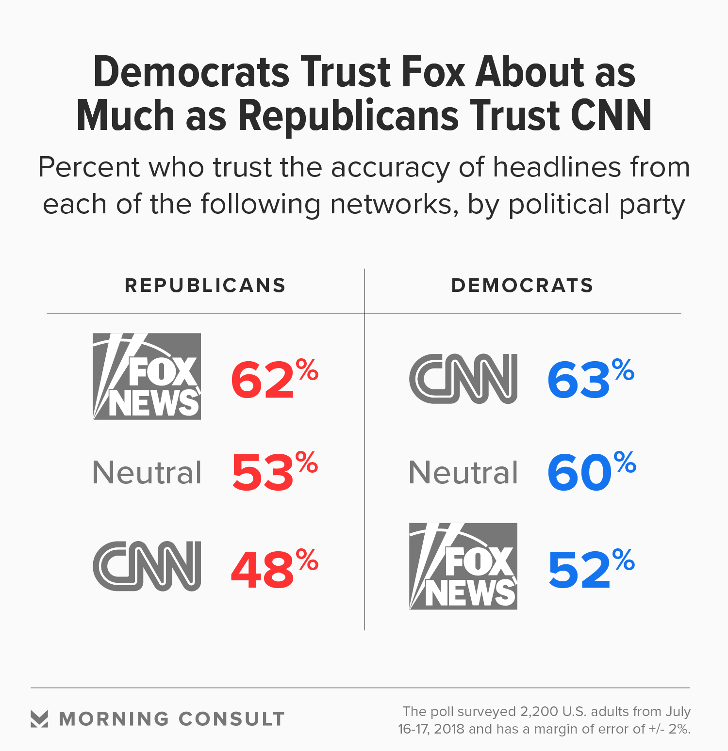 A new Morning Consult project sought to test how people would assess headlines from different news outlets. The survey included identical headlines (example: “Trump signs order to end immigrant family separations”) under three different logos and stylized navigation bars that represented CNN, Fox News and a neutral, unnamed outlet. Respondents only saw one topical headline per outlet and were told the headlines were hypothetical.