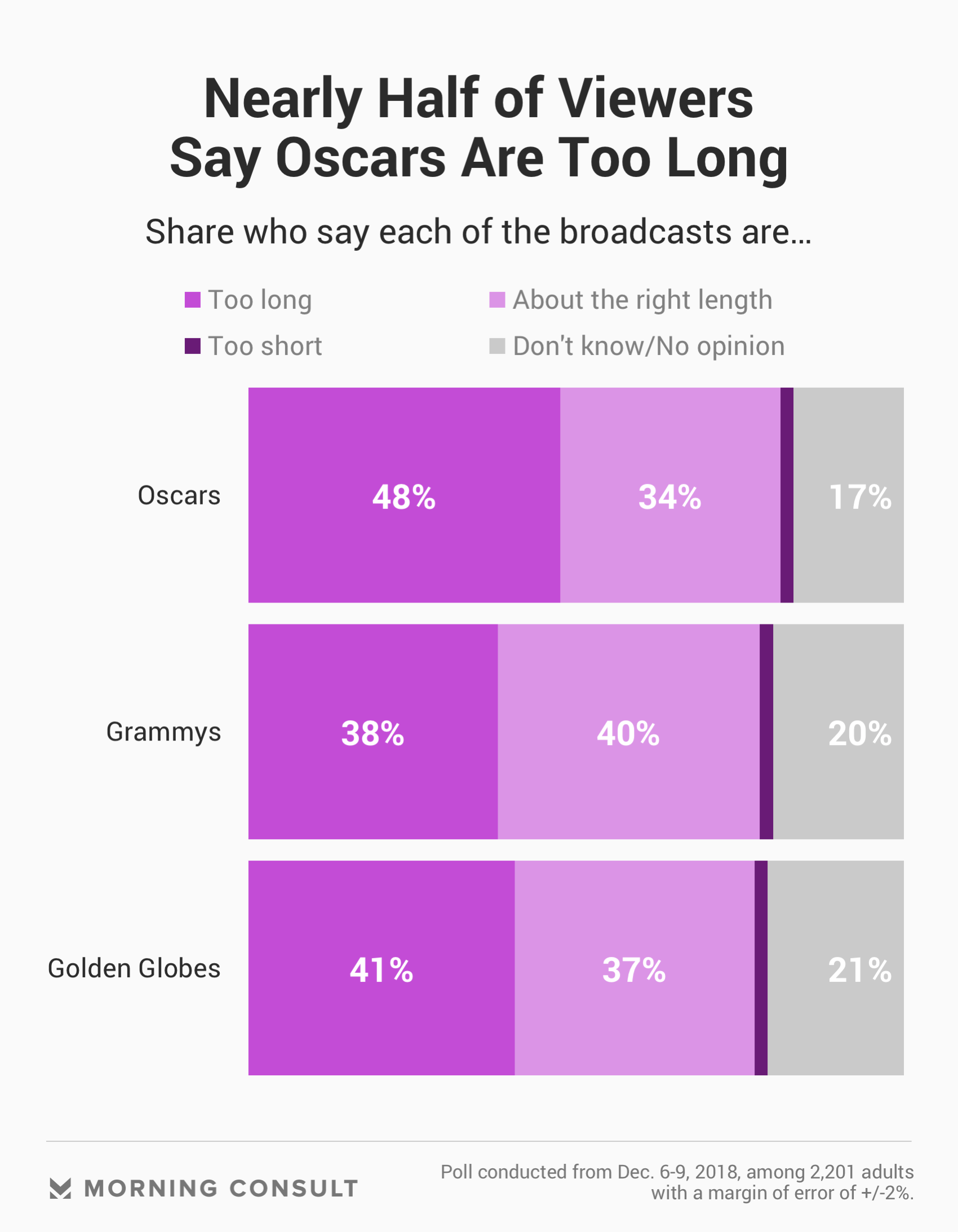 Forty-eight percent of adults, a plurality, said the Oscars telecast was too long (2018’s Oscar telecast ran for three hours and 54 minutes), and the public is divided on the length of the Golden Globes (three hours in 2018) and the Grammy Awards (three and a half hours in 2018).