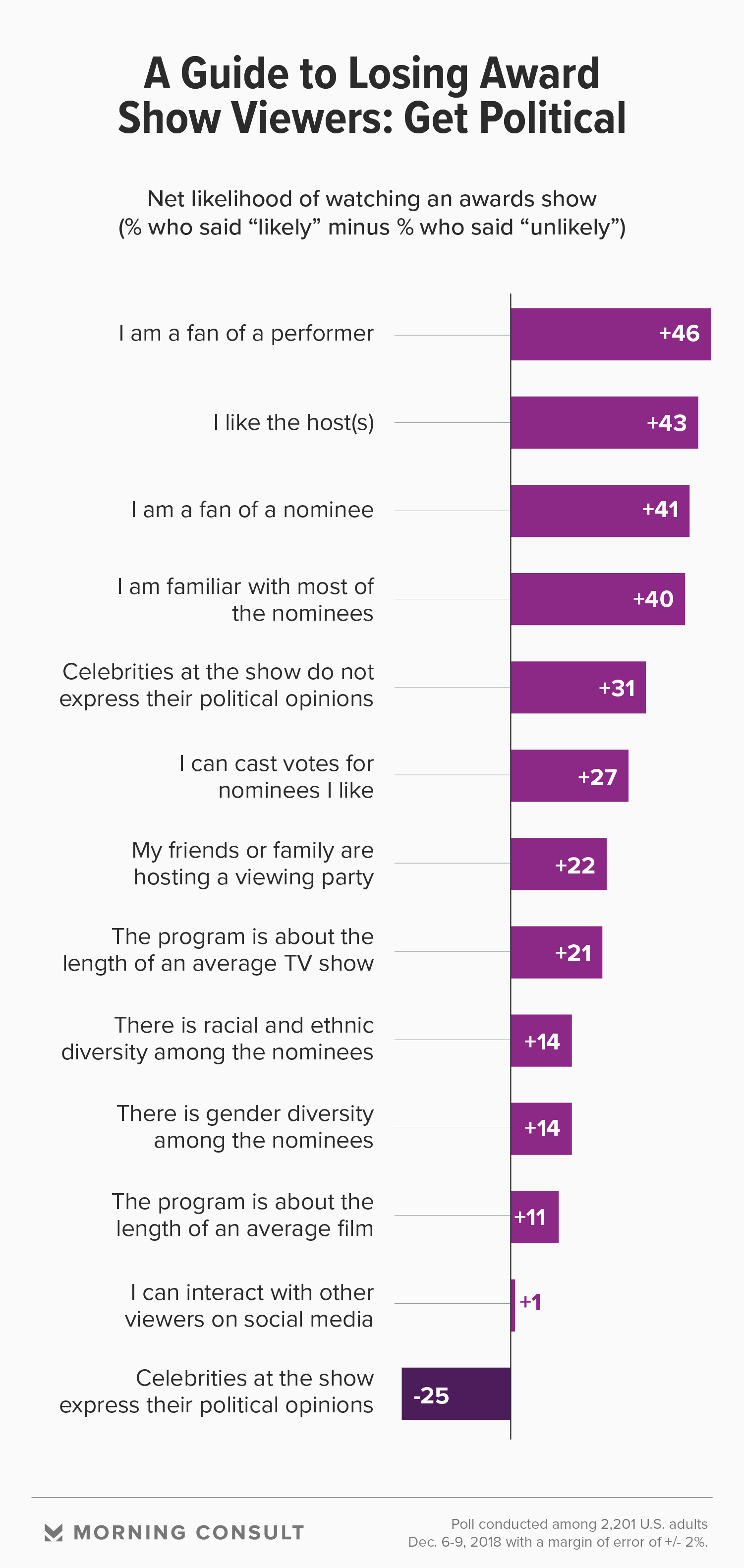 A Dec. 6-9 Morning Consult/The Hollywood Reporter survey of 2,201 U.S. adults finds that the key to commanding audiences is a shorter program with more guests and hosts viewers already like or are familiar with -- and leave the politics at home.