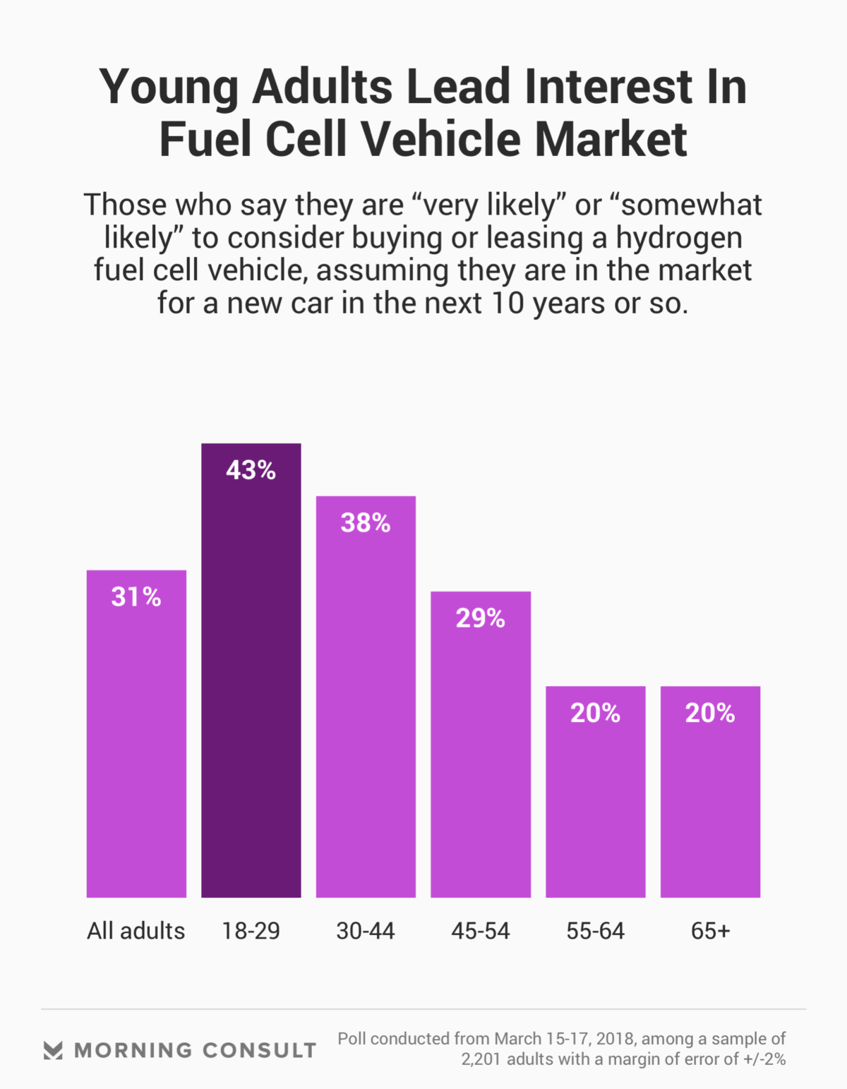 A Morning Consult survey shows Toyota has a long way to go to raise the profile of the Mirai, which debuted in the United States in 2015. In a poll of 2,201 people conducted March 15-17, 58 percent said they haven’t heard anything about the car, compared to 21 percent who had heard “not too much” about it and 21 percent who had heard “some” or “a lot.” The poll’s margin of error is 2 percentage points.