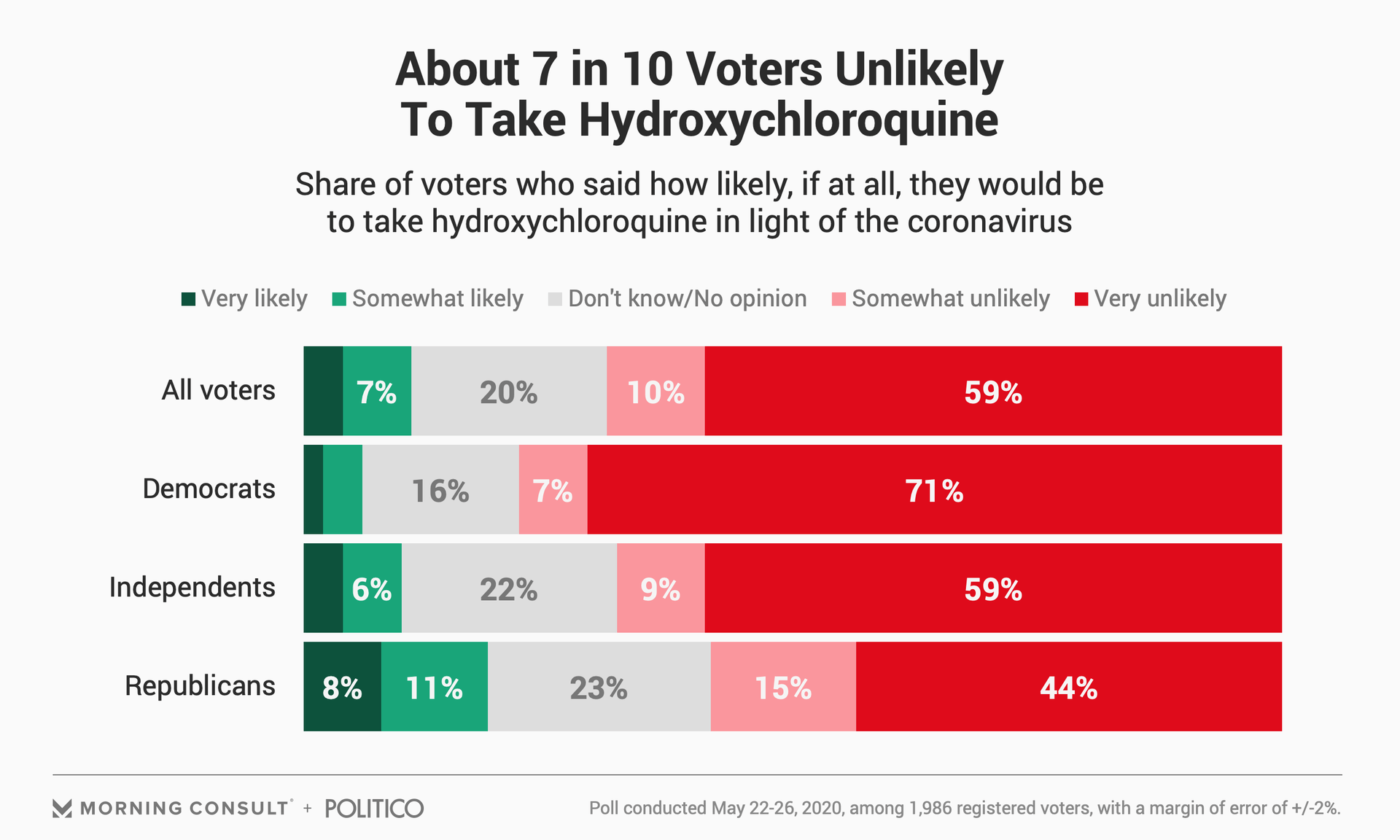 - Nearly 7 in 10 voters say they are unlikely to use hydroxychloroquine themselves in light of the coronavirus, including 59% of Republicans.