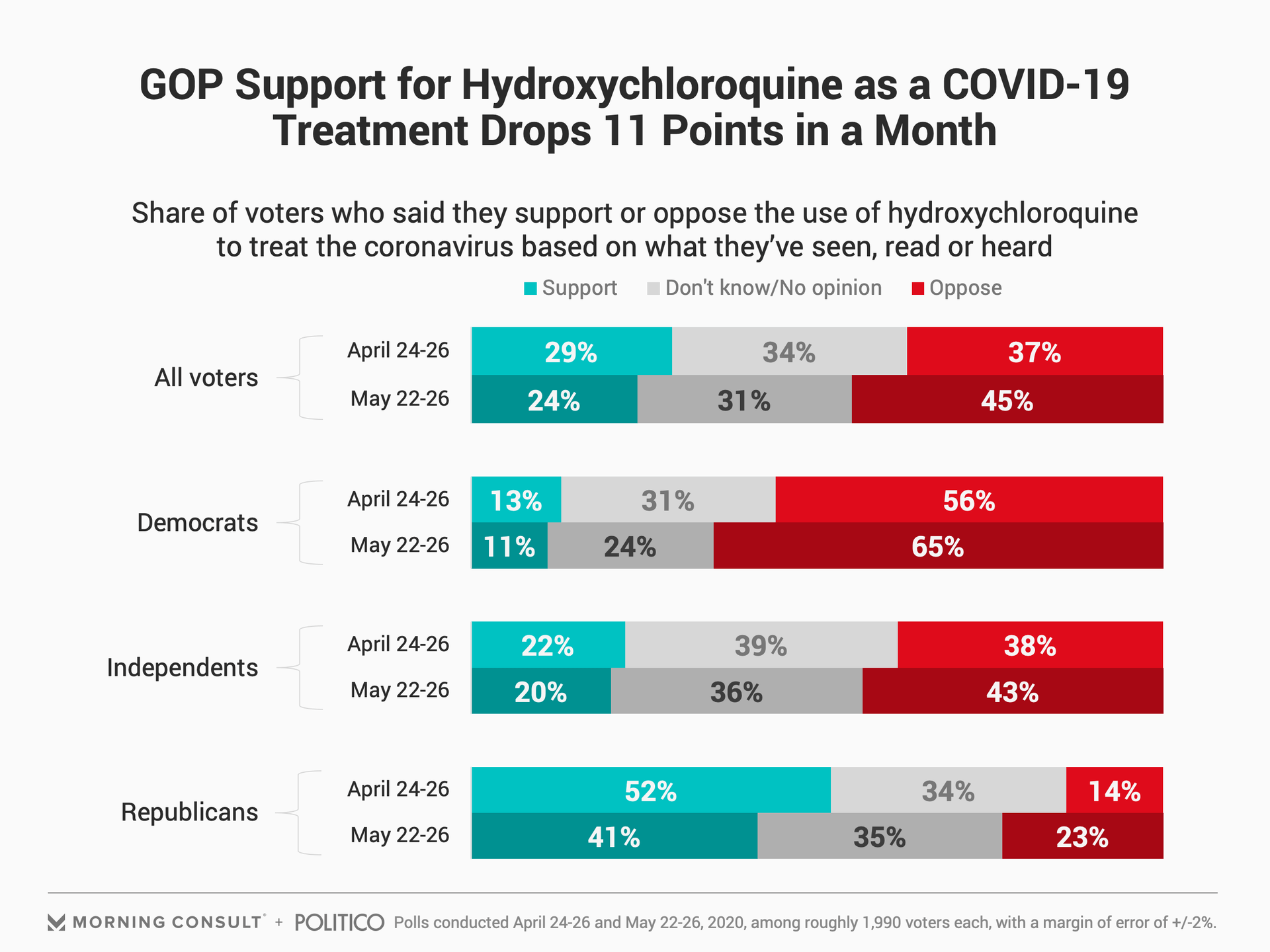 The biggest drop in support over the past month came from Republicans. In late April, 52 percent said they supported hydroxychloroquine to treat COVID-19, but in the latest poll, support dropped 11 points to 41 percent. Twenty-three percent of GOP voters opposed the potential treatment this month versus 14 percent who said the same in late April.
