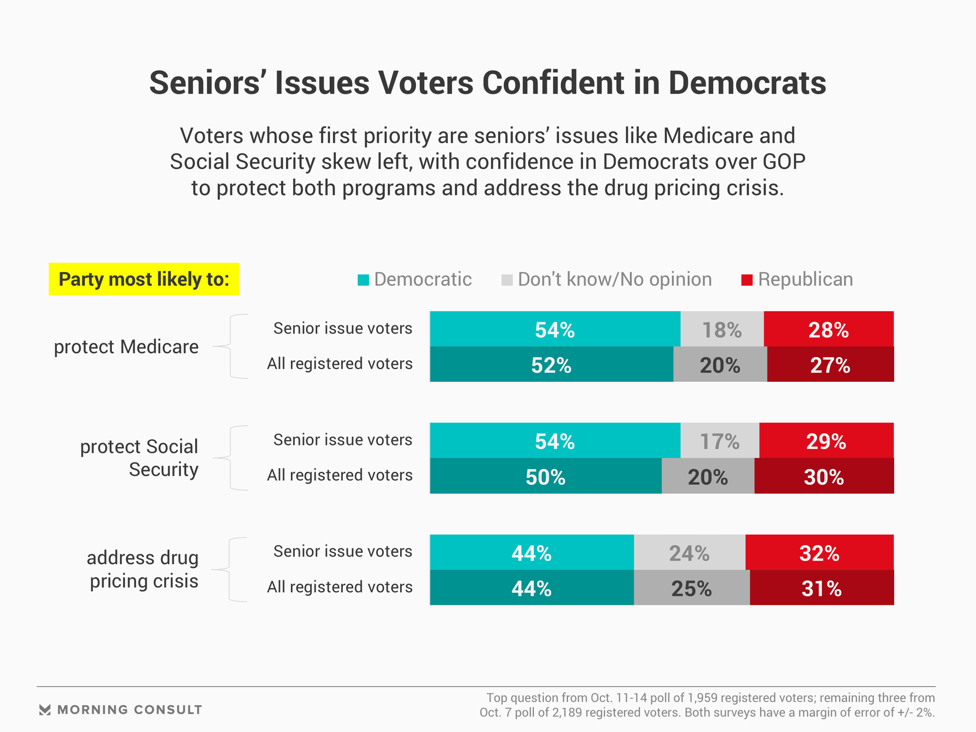 On drug pricing, the Oct. 7 poll shows Democrats enjoy a 12-point lead over Republicans, with 44 percent of seniors’ issue voters saying they believe Democrats are more likely to address the rising cost of prescription drugs compared to 32 percent who say Republicans are more likely.