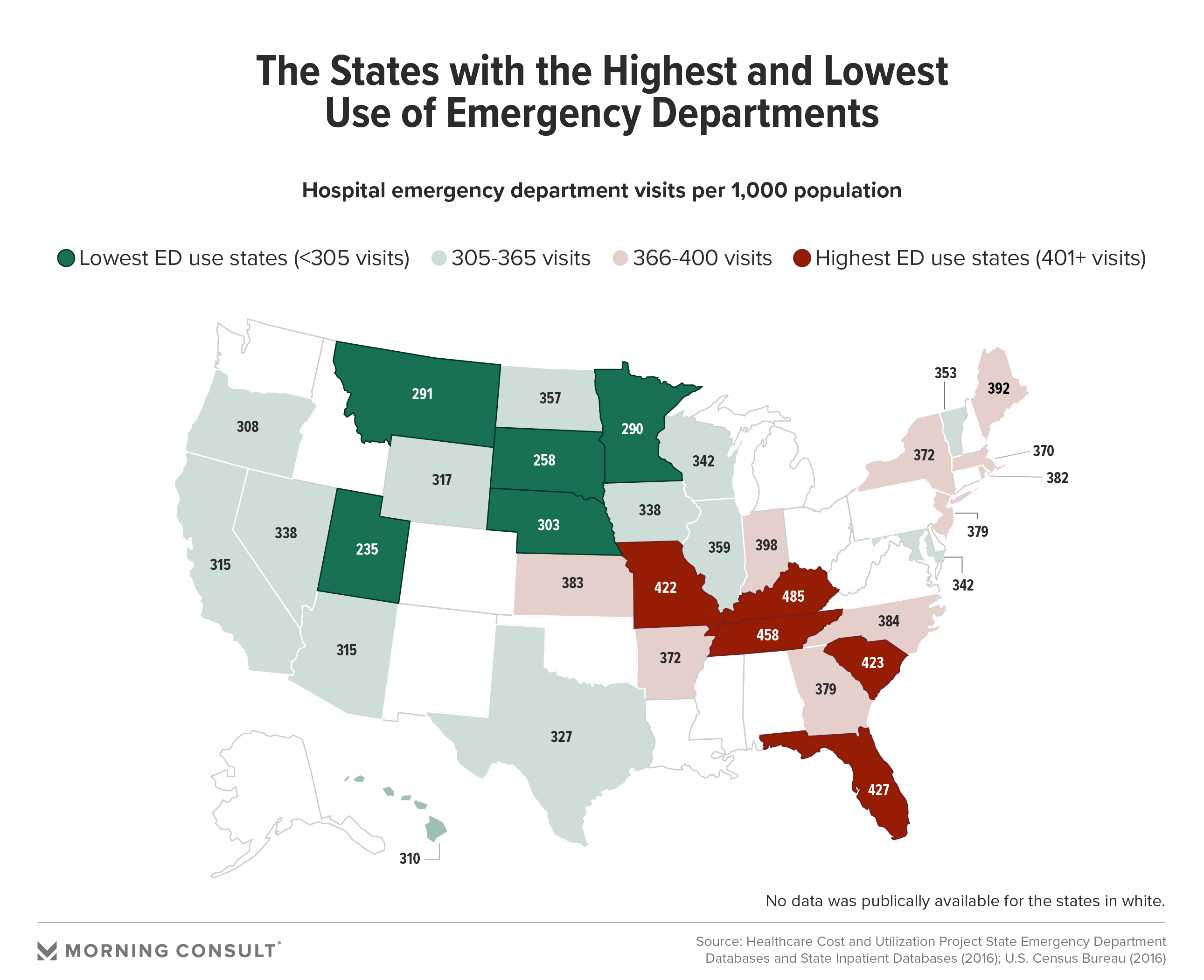 Experts studying the social determinants have long focused on the emergency room, where the consequences of such social disparities are on display. A Morning Consult analysis of the relationship between emergency department visits at the state level and 28 indicators of the determinants reveals a strong relationship between ED use and markers of education, employment and mental health in states with the highest and lowest use of emergency care.