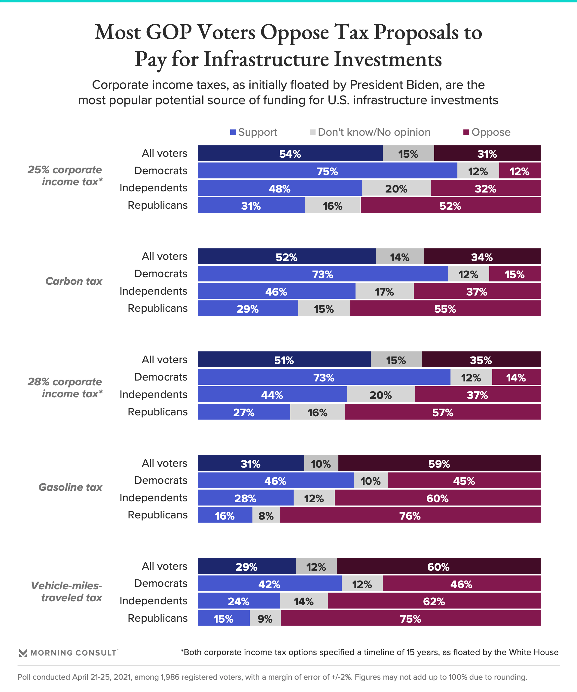 However, new polling from Morning Consult polling found that none of these more targeted options is as popular with voters as a 25 percent corporate income tax (a rate Manchin has said he would be open to), backed by a share of 54 percent and opposed by 31 percent.