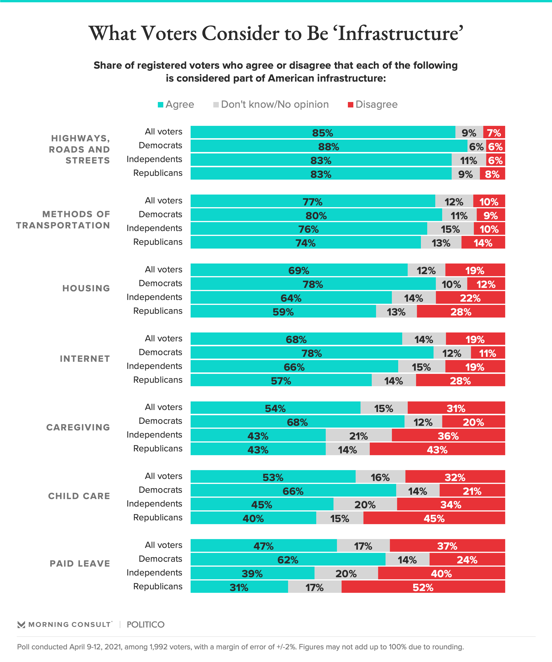Highways, roads and streets (85 percent) and methods of transportation (77 percent) had the highest share of voters who agreed that those categories are part of U.S. infrastructure. Of the categories listed, only “paid leave” (at 47 percent agreement) was not considered infrastructure by a majority of voters.