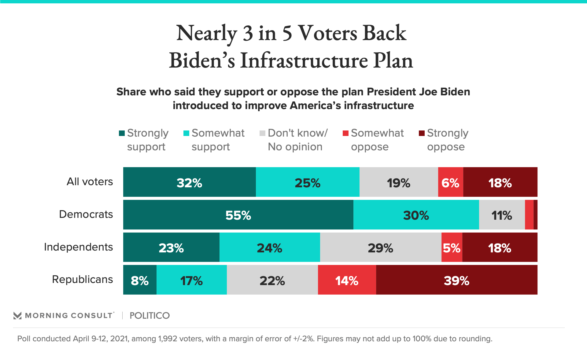 Republican support for President Joe Biden’s infrastructure plan (and how to pay for it) is quickly waning, according to new Morning Consult/Politico polling, suggesting that GOP messaging around the issue is gaining traction with the party’s base.