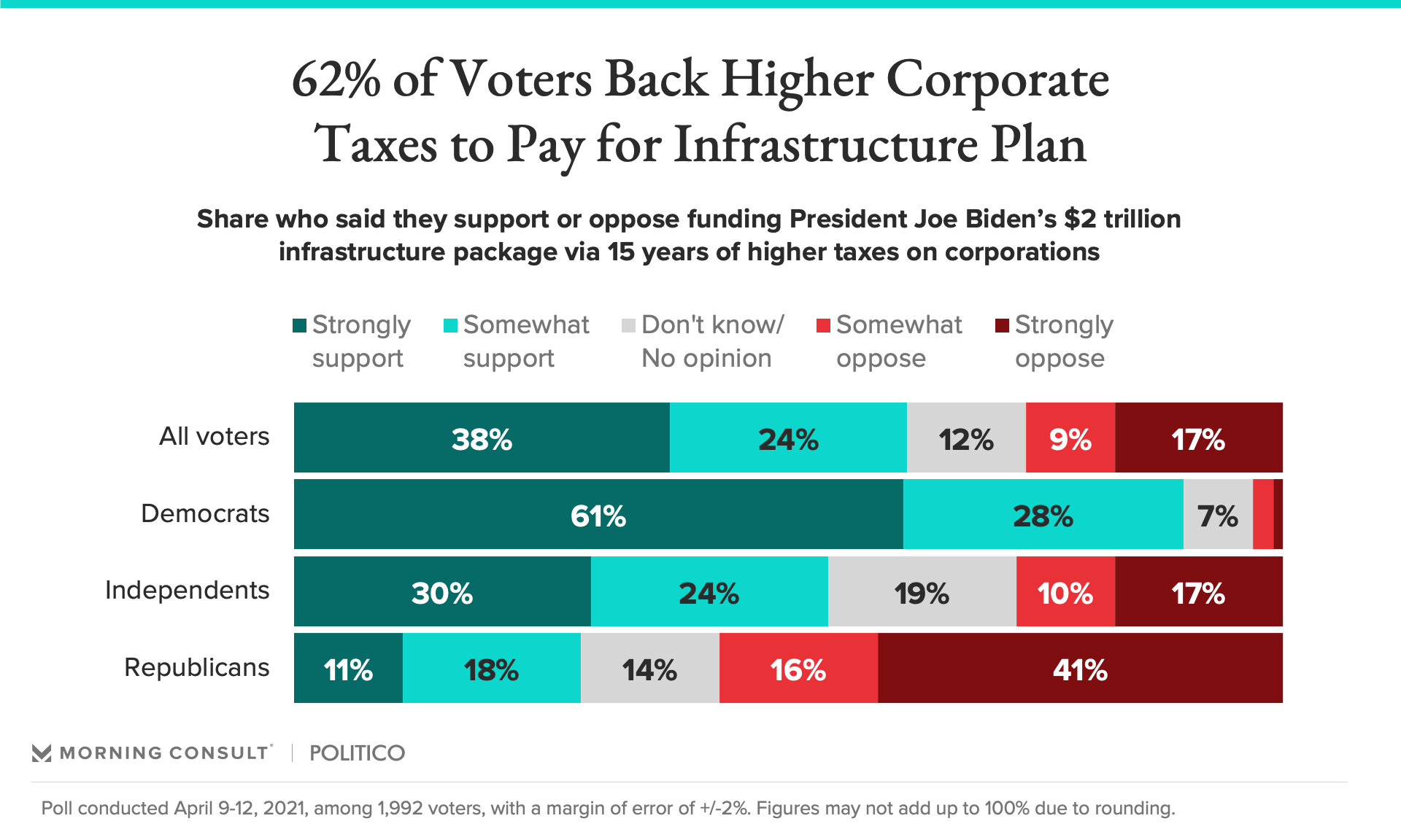 Twenty-nine percent of Republicans this week said that they support the corporate tax increase to pay for Biden’s infrastructure plan, compared to 42 percent last week, a 13-point decline. Support among all voters fell 3 points to 62 percent.
