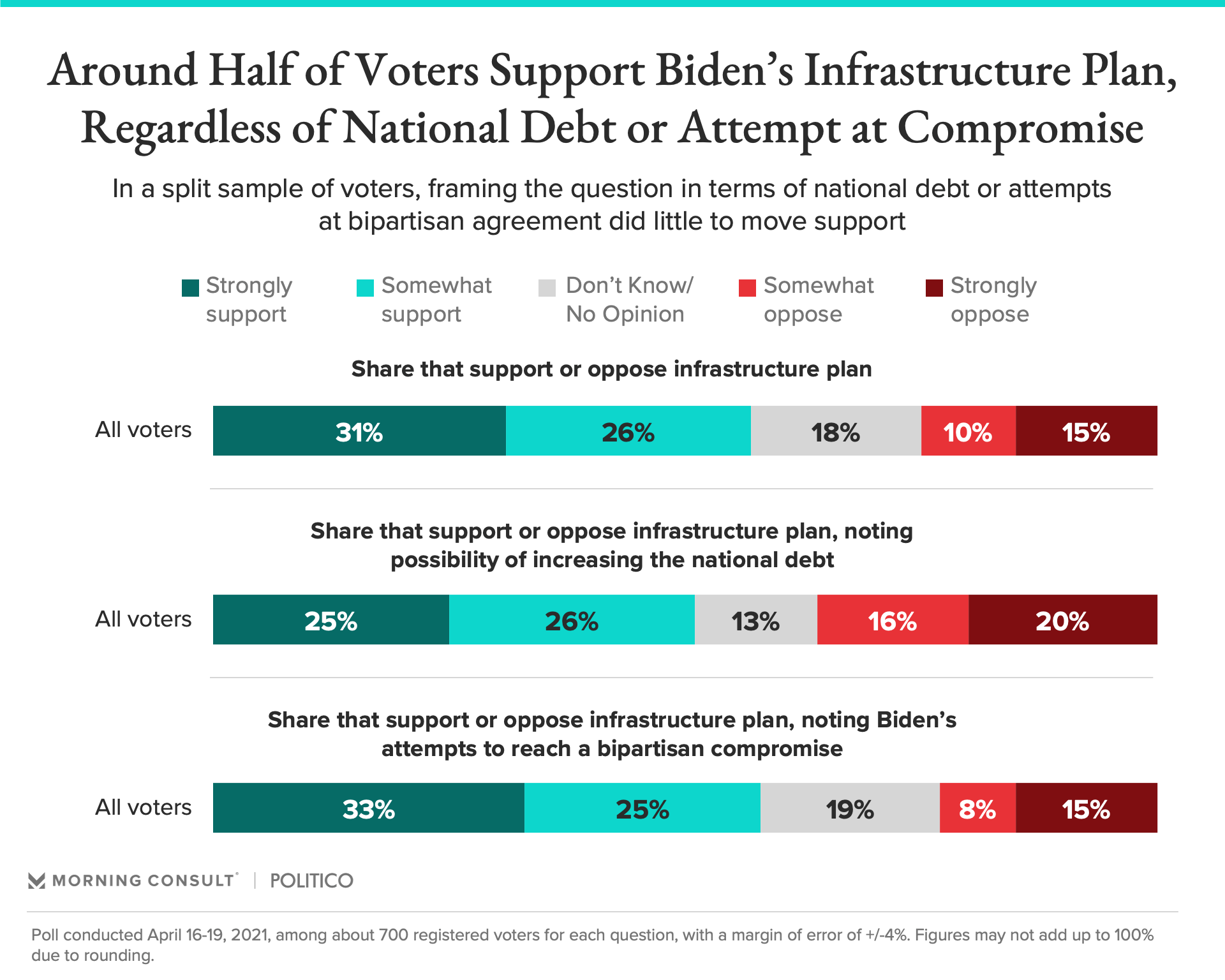 A majority of registered voters continue to back President Joe Biden’s infrastructure plan, with support nearly unchanged when respondents were informed of Biden’s bipartisan efforts in pursuing a compromise or accounting for the possibility of the package raising the national debt, according to new Morning Consult/Politico polling.