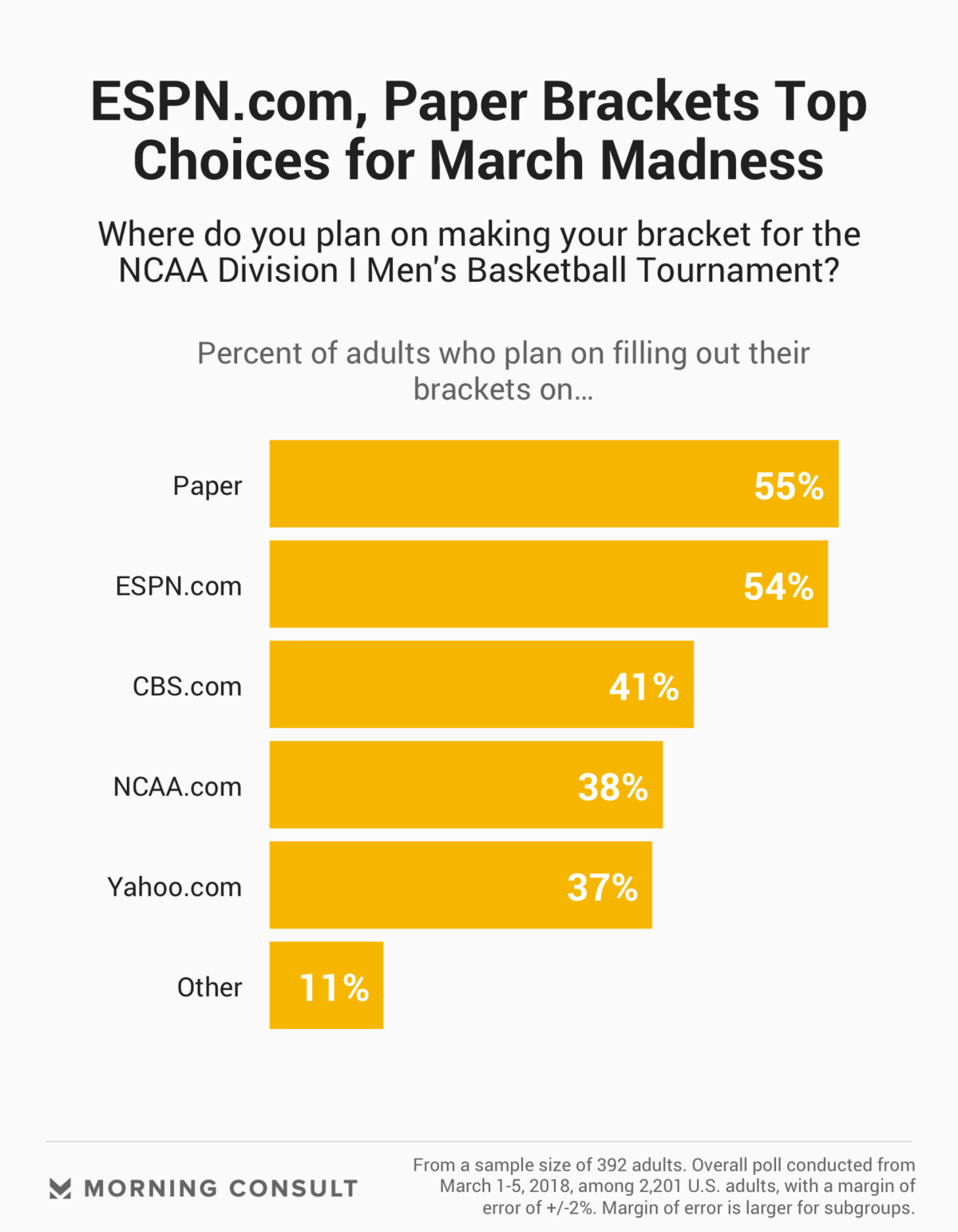 Some tournament-related viewing activities were little changed. Eighteen percent said they plan on filling out a March Madness tournament bracket this year, in which people pick winners for every head-to-head matchup throughout the tournament. A year ago, 20 percent said they planned to fill out brackets.