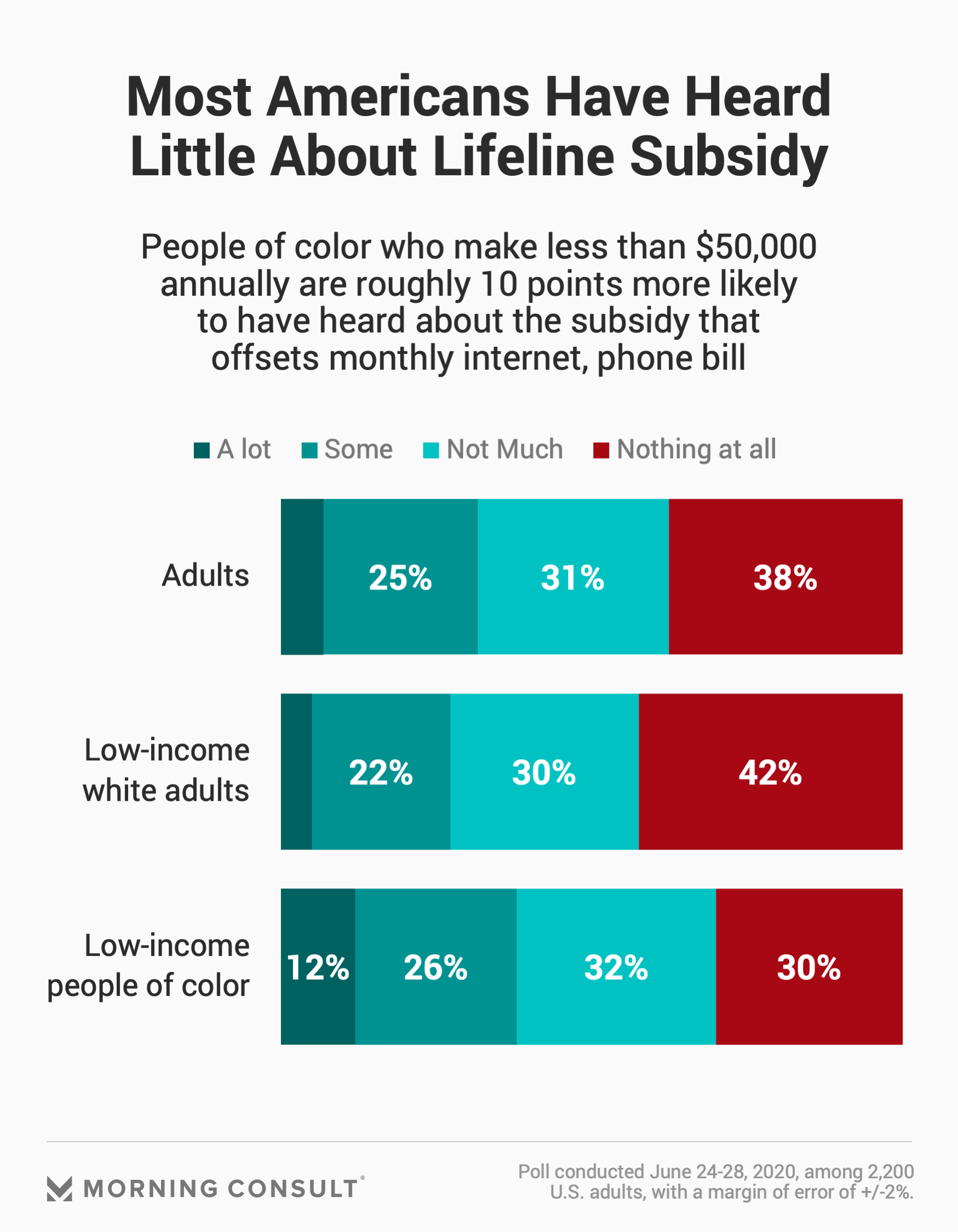 However, pandemic-inspired changes to the Lifeline program could face an uphill battle: customer awareness. According to the survey, 69 percent of lower-income adults have either heard not much or nothing at all about the Lifeline program’s existence, despite the program being in place since 1985. Among lower-income people of color, 38 percent have at least heard some about the program, compared with 27 percent of white lower-income adults.