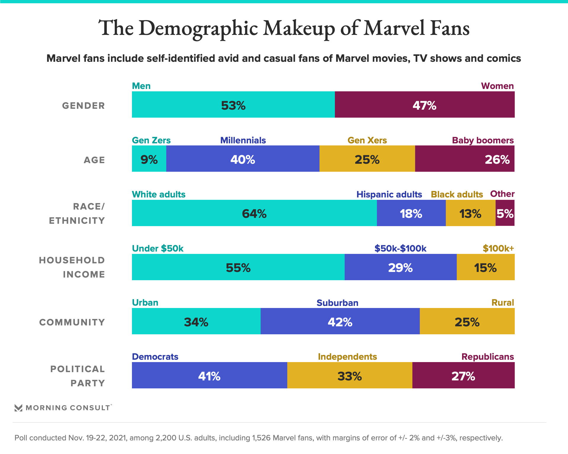 - Marvel fans are slightly more likely to be male (53 percent) than female (47 percent). The demographic is also overwhelmingly white, while 18 percent of fans are Hispanic and 13 percent are Black.