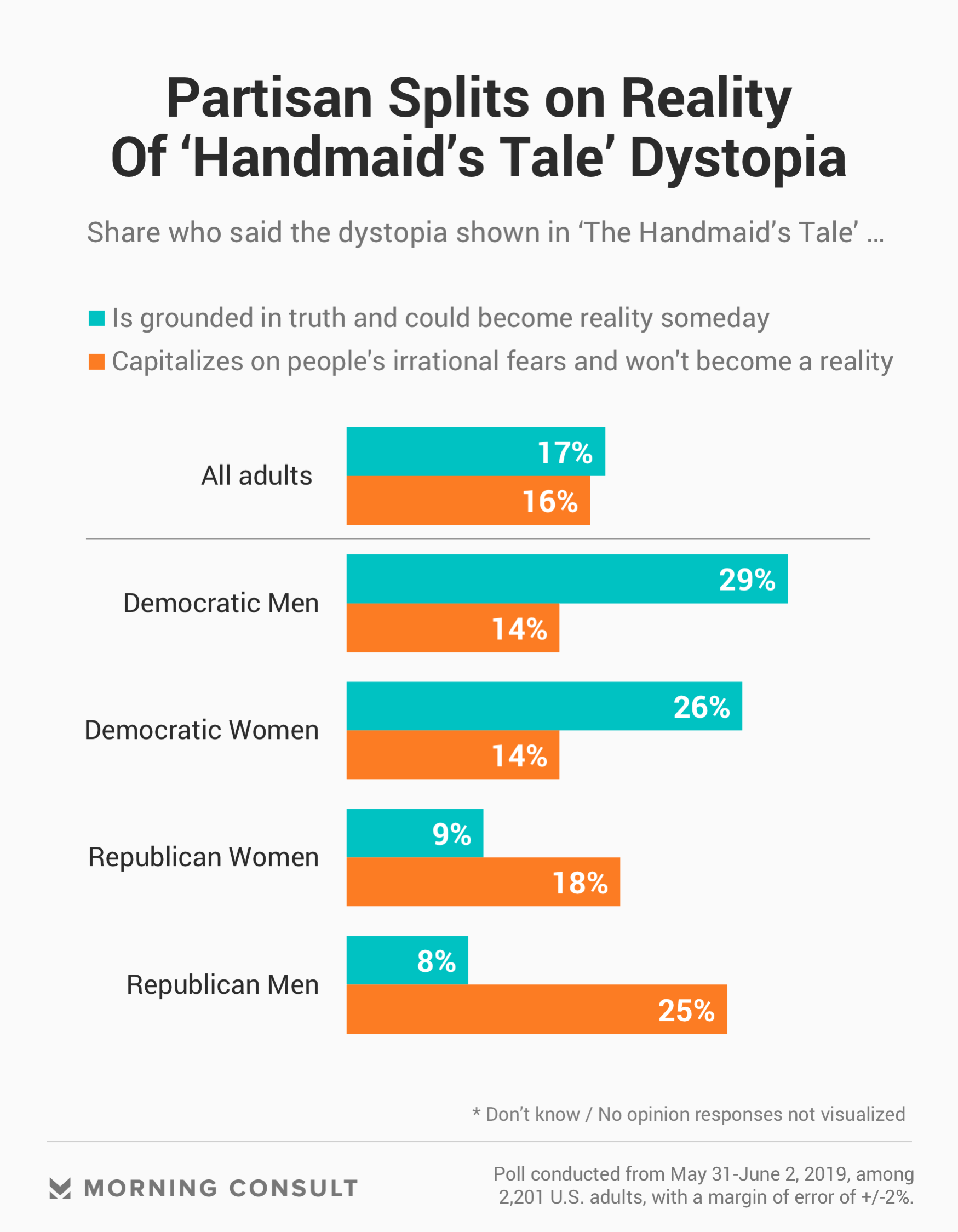 It found that people were generally split on whether “The Handmaid’s Tale” could reflect America’s future: 17 percent agreed with the statement that the show’s dystopia was “grounded in truth and could become a reality someday,” while 16 percent said the show “capitalizes on people's irrational fears and won't become a reality.” Sixty-seven percent said they didn’t know or had no opinion.
