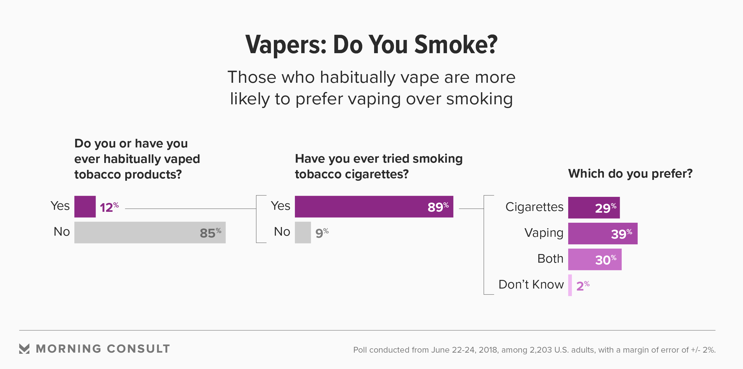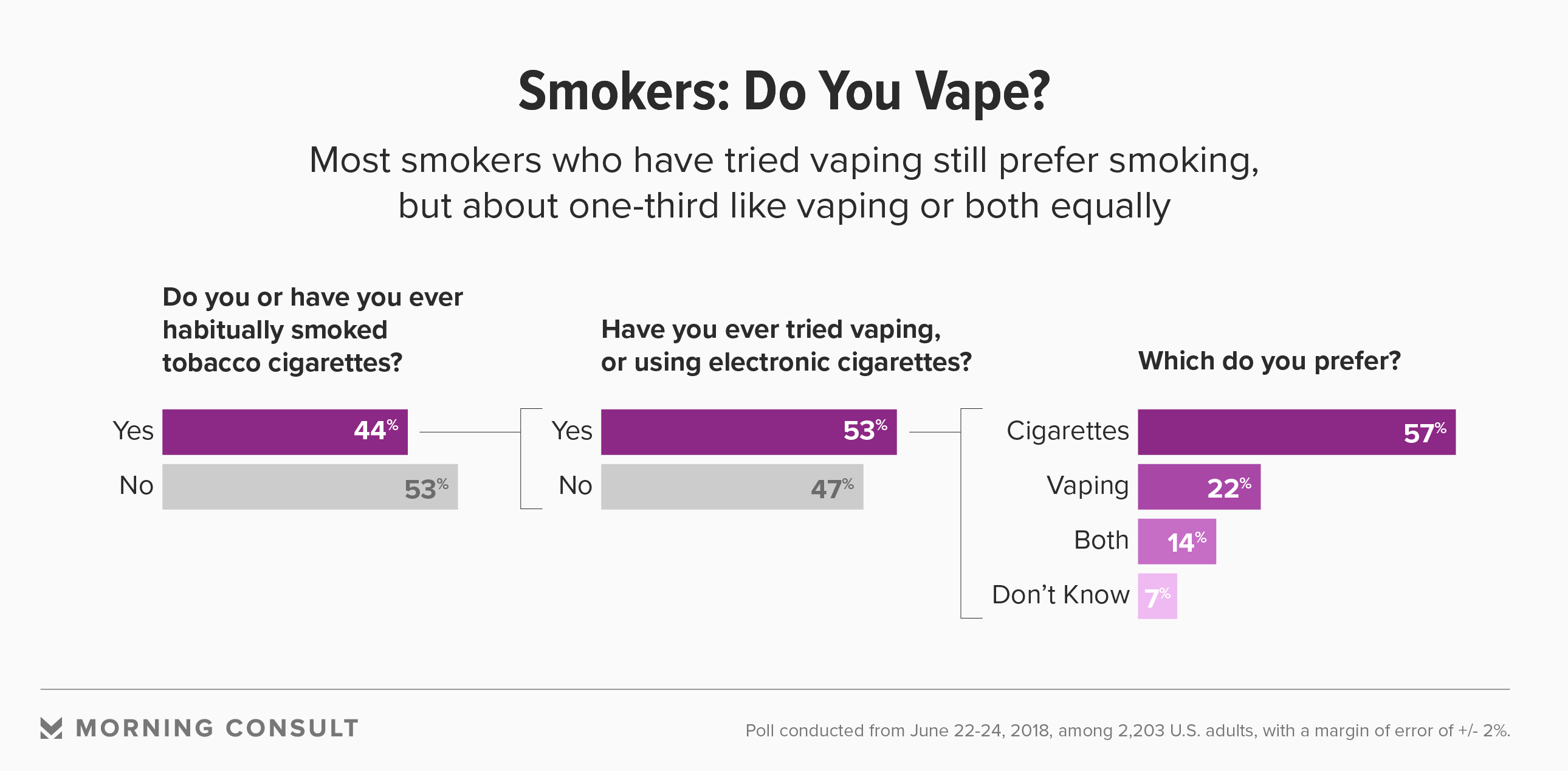 A new survey from Morning Consult shows a fair amount of overlap among smokers and vapers, though smoking is nearly four times more common, with 44 percent of respondents saying they’ve smoked or still do, versus 12 percent who said the same about vaping.
