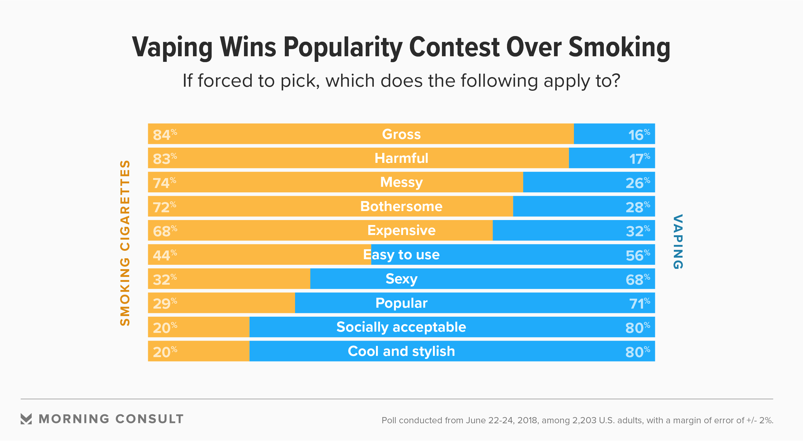 The public is more likely to associate “gross” and “harmful” with tobacco cigarettes than with vaping, according to Morning Consult’s poll. Vaping is also more likely to be characterized as “cool and stylish” and “socially acceptable.” Just over two-thirds of the public think “sexy” better describes vaping over smoking cigarettes.