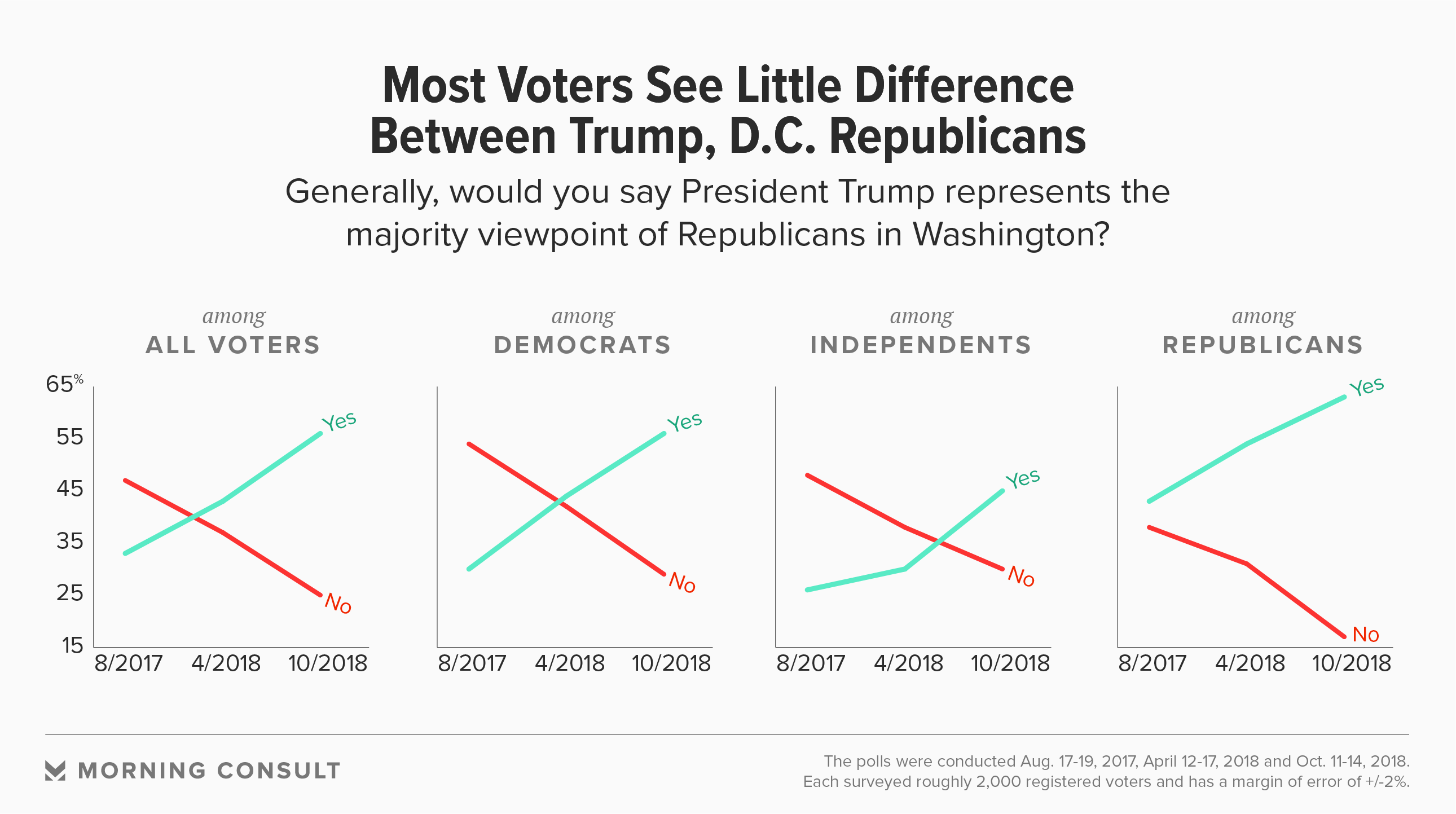 In the latest Morning Consult/Politico poll -- conducted Oct. 11-14 among 1,959 registered voters -- 56 percent of respondents said Trump represents the majority viewpoint of Washington Republicans. That is 13 percentage points higher than a similar poll conducted in April, and up 23 points since August 2017. All three surveys had 2-point margin of error.
