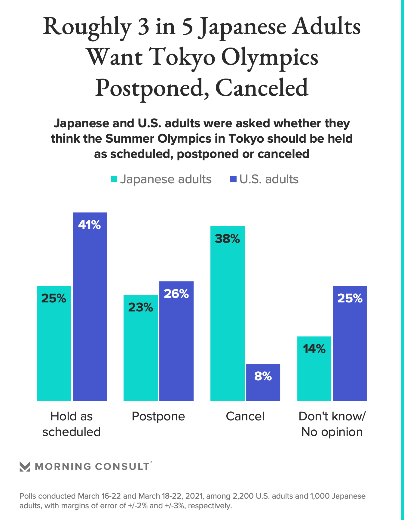 In a Morning Consult poll conducted March 18-22, the share of Japanese adults who said the Tokyo Games should either be postponed again or canceled outright was more than twice as large as the contingent that favored moving forward with the Olympics this summer as scheduled.