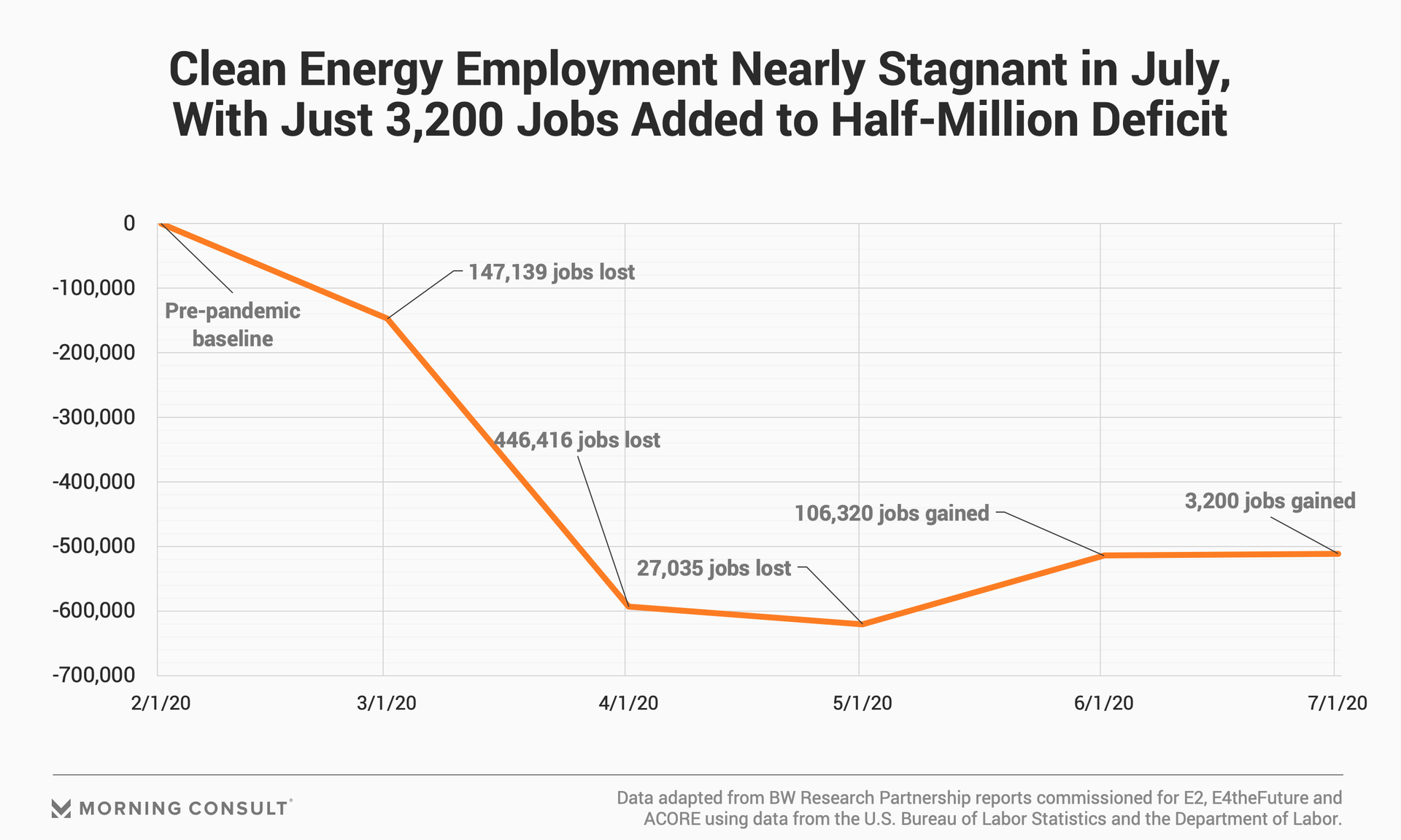 Clean energy’s ongoing recovery from the coronavirus pandemic has essentially stagnated, with the U.S. sector adding just 3,200 jobs in July after more considerable gains in June, according to the latest research from BW Research Partnership Inc.
