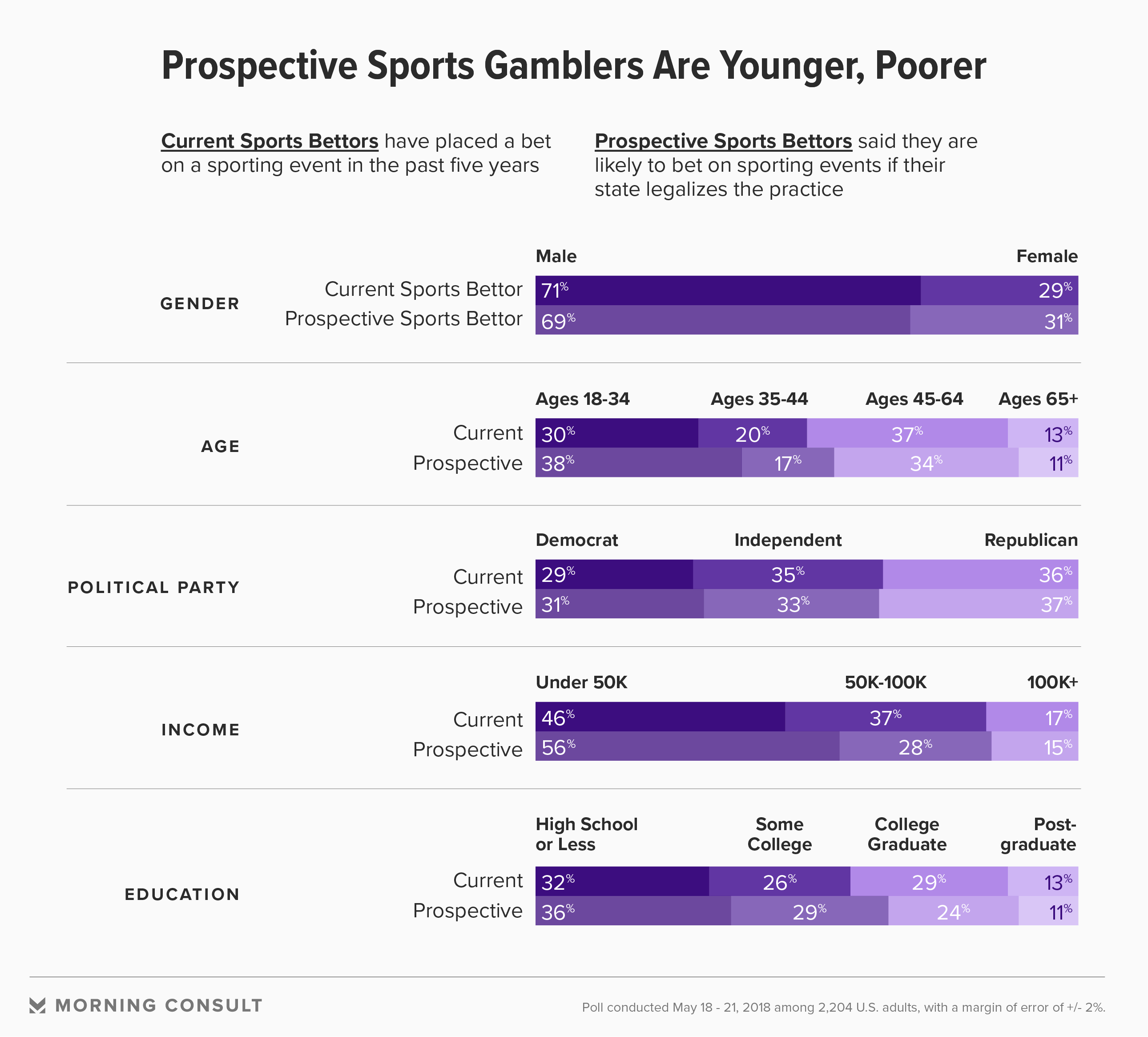 Current and prospective sports bettors in the poll look fairly similar demographically, with two important exceptions: Prospective bettors are more likely to be age 34 or younger than current bettors (38 percent vs. 30 percent) and more likely to be making less than $50,000 in annual income (56 percent vs. 46 percent).