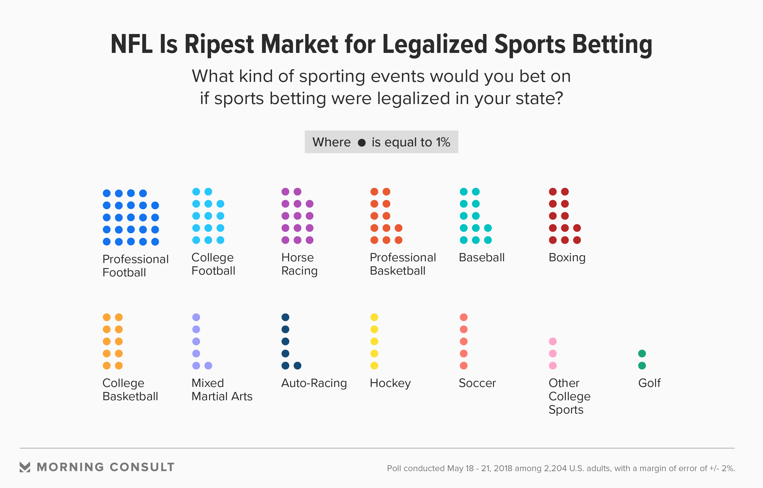 The Morning Consult poll conducted May 18-21 shows that the National Football League would benefit the most from legalized sports betting, with nearly one-quarter of the 2,204 U.S. adults surveyed saying they’d put their money on the league’s games if the practice were legalized in their state. The survey has a margin of error of 2 percentage points.