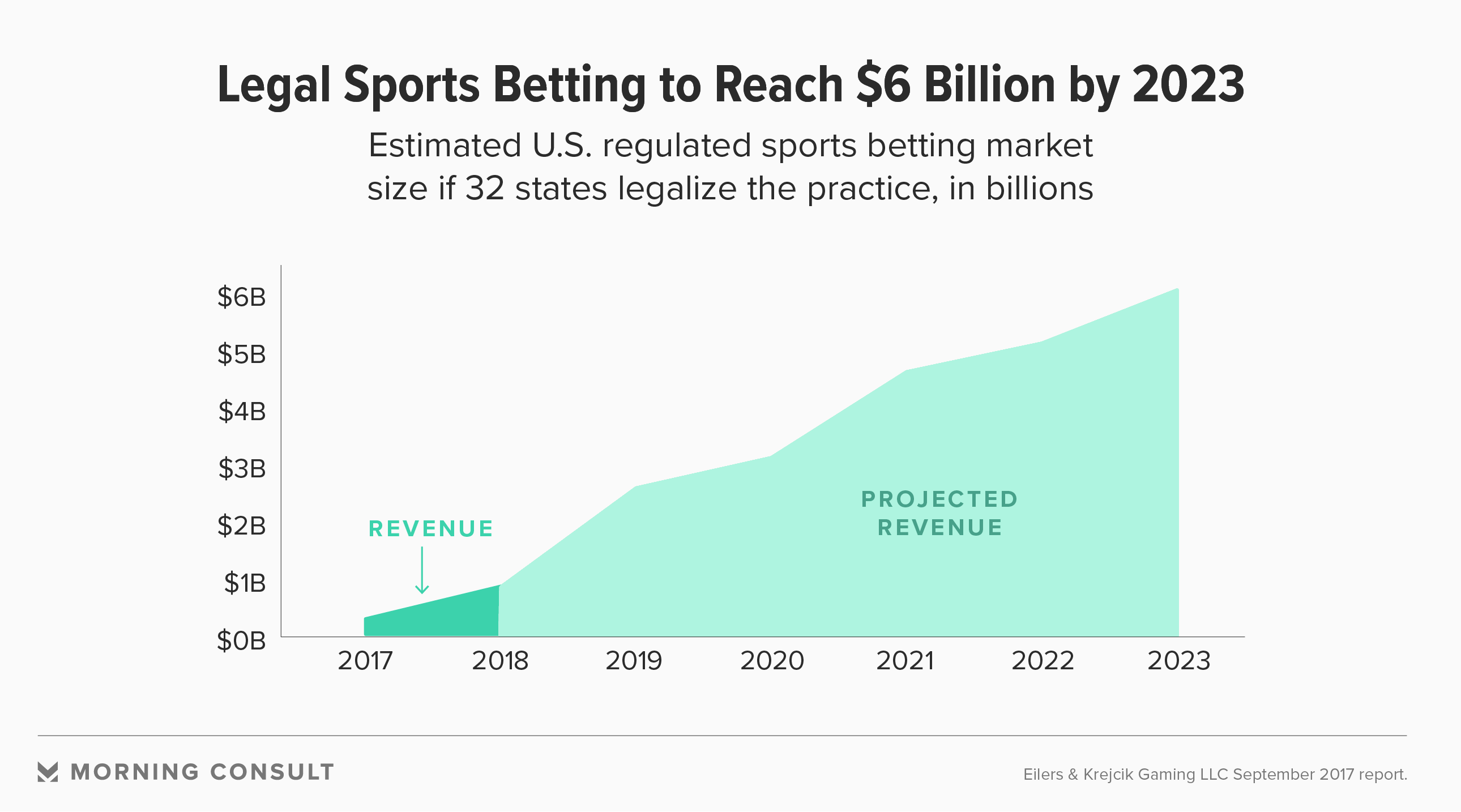 Sports betting projections paint a prospering market. If 32 states allow sports betting over the next five years, both in person and online, annual gaming revenues in the United States could reach $6 billion by 2023, according to a September 2017 report from Eilers & Krejcik Gaming LLC, a boutique research firm focused on gaming and technology.