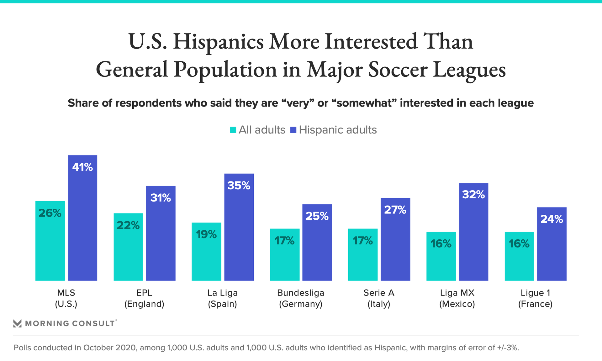 41% of U.S. Hispanics said they are interested in MLS and 35% said they're interested in La Liga.