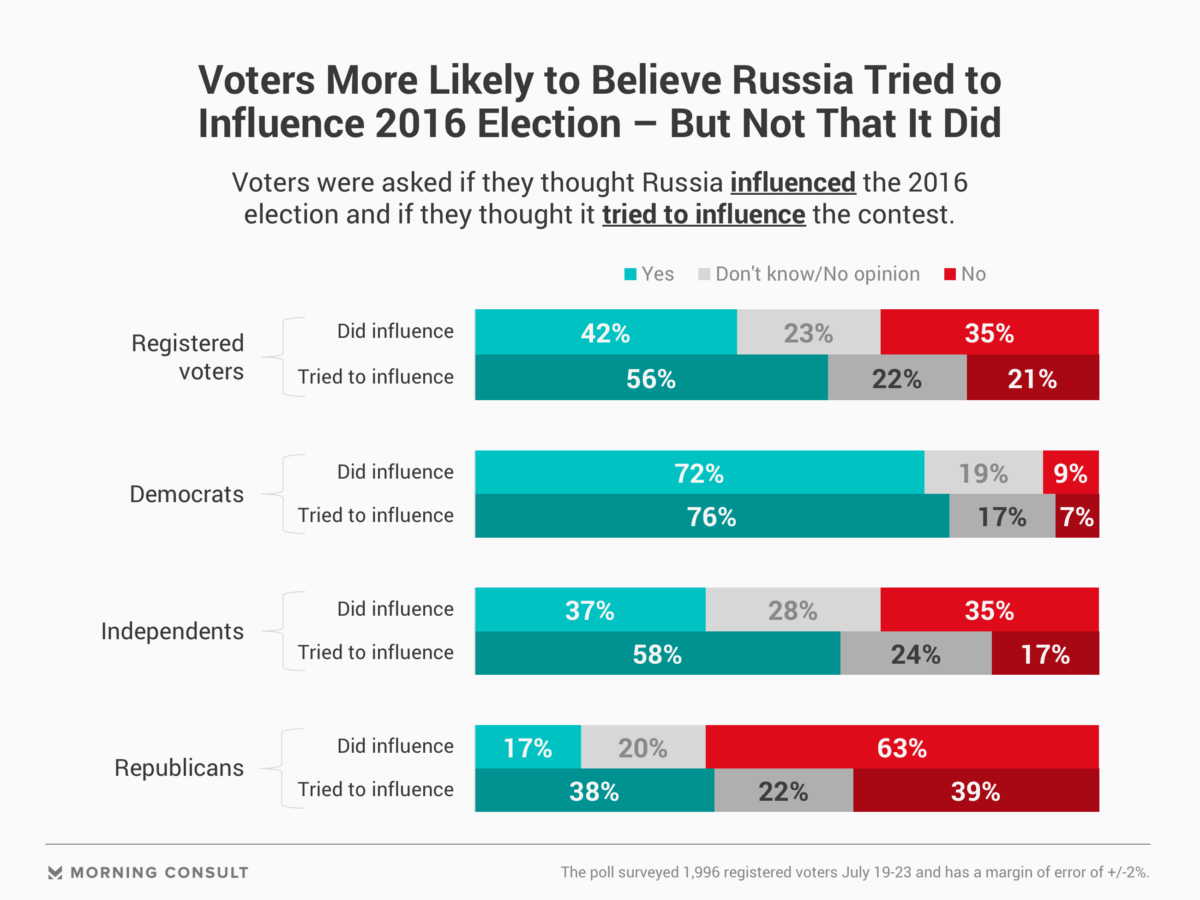 Republican voters were almost evenly split on whether Russia attempted to sway the last presidential election, 38 percent to 39 percent.